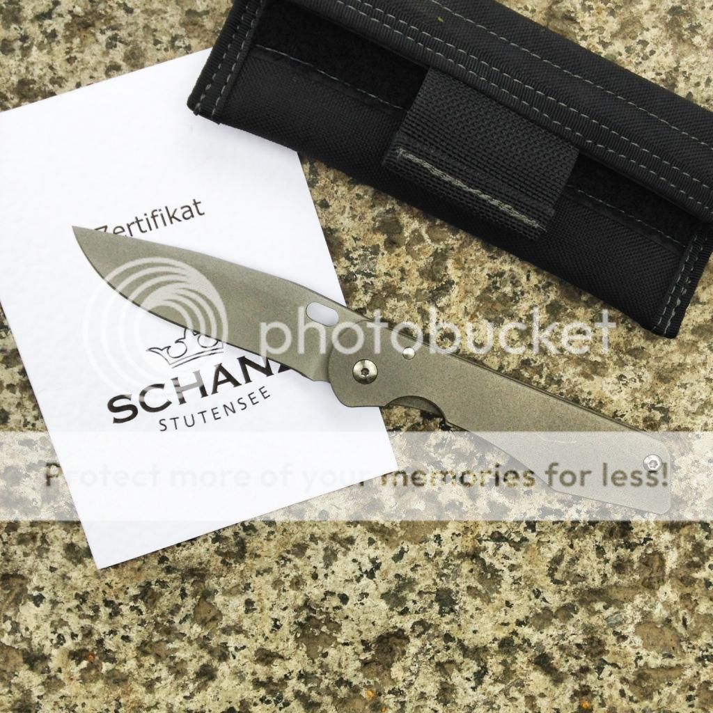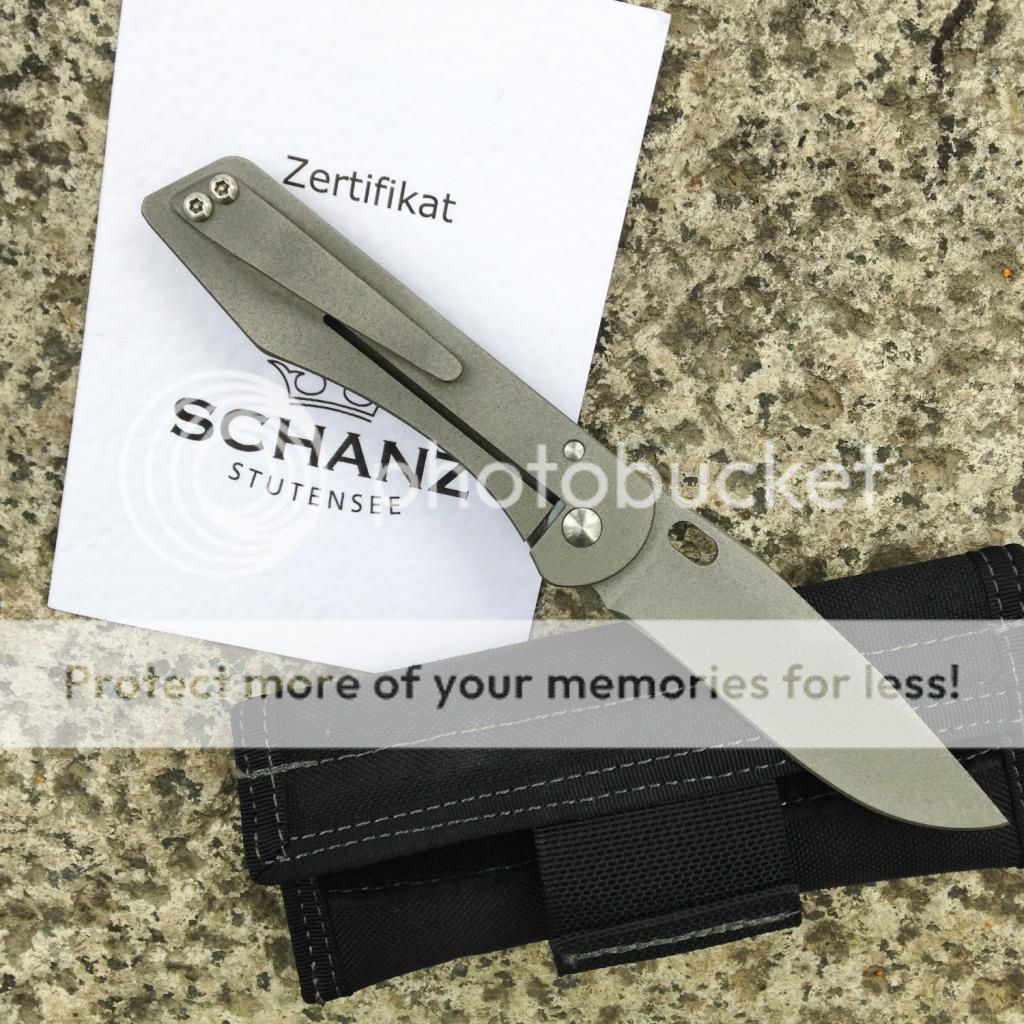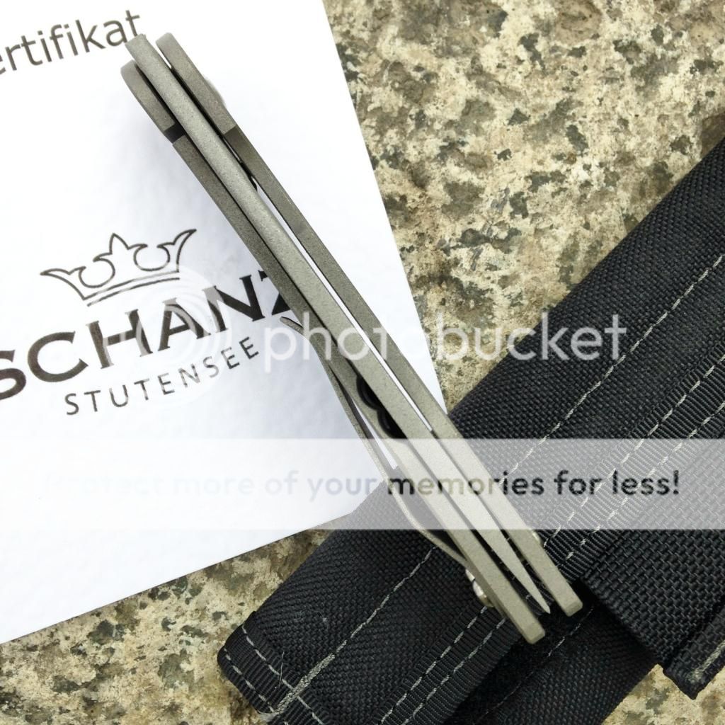 This hard to come by Schanz DPPK2 is a nice and sleek framelock with SB1 steel (same or similar to Nialox) blade and matching bead blast titanium frame. Perfect lockup at about 30 percent and blade is centered. Very smooth action and is easy to open using the hole. Blade is perfect and has only cut paper. There is a scuff/scratch on the frame as shown in photos. I tried to get make it look it’s worst. Comes with Certificate of Authenticity and soft Arizona Custom Knives case.