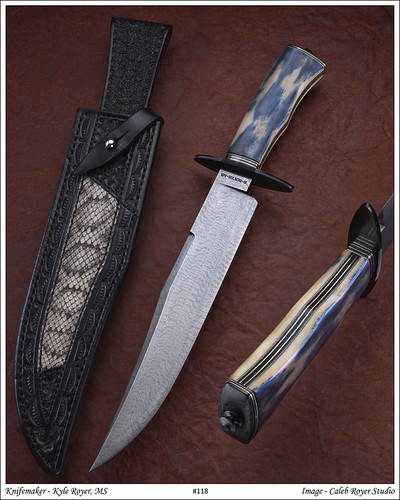 It has a 9 1/2 inch blade and its forged from 1080 and 15N20 in a Tight Mosaic, four bar Twist Damascus Pattern. The handle is premium blue/cream colored Mammoth Ivory. The customer supplied the mammoth and it was/is a nice looking set! The fittings are of the same damascus pattern as the blade and they have 18 karat green gold inlays. The fittings have also been gun blued. The liners are made of German Silver and have been coined with forty lines per inch. The guard is oval with coining and round grooves around its profile. I made the sheath too and it has a Diamondback Rattlesnake skin overlay.