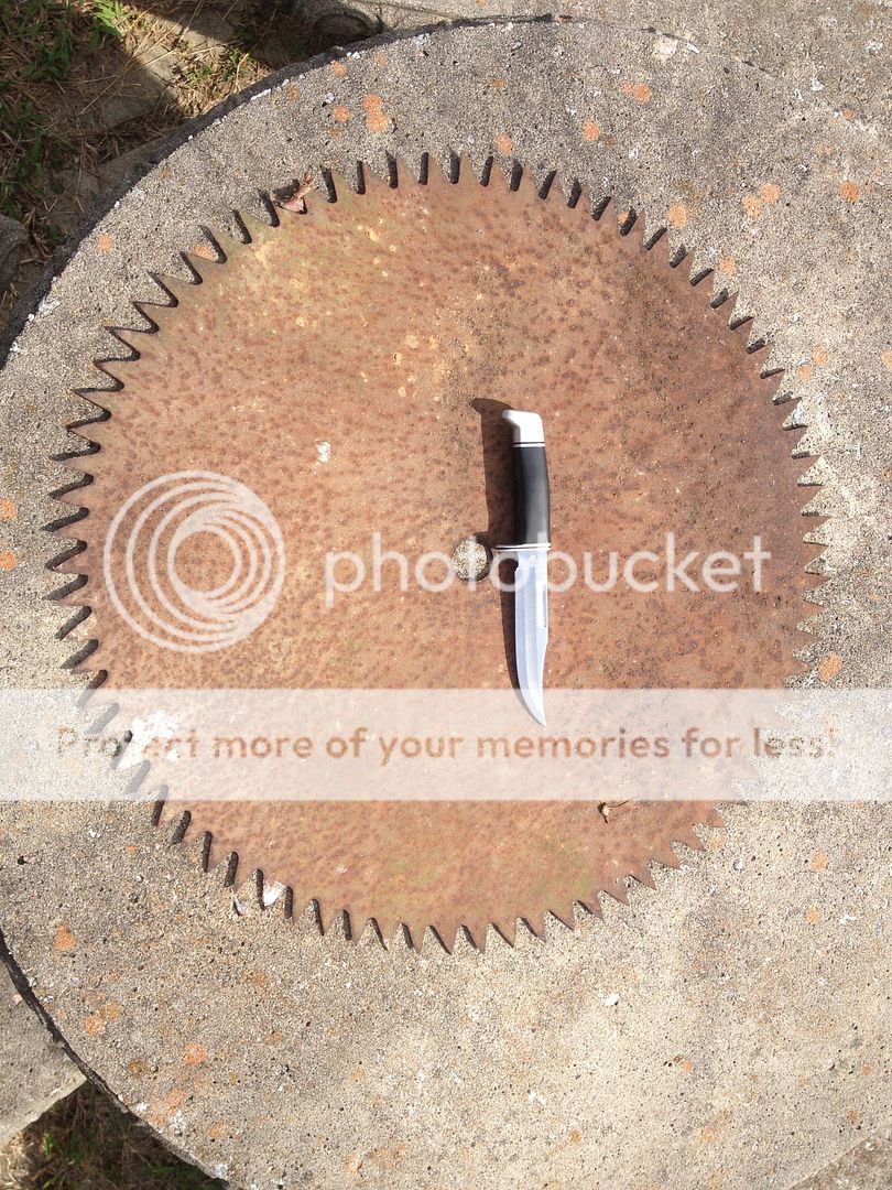 I'm not sure of the composition but I know it's an old saw blade and it's about 1/4 inch thick. It's actually still relatively sharp. I place my Buck 119 in the pick for a size reference. This should satisfy my needs for some projects for a while.
