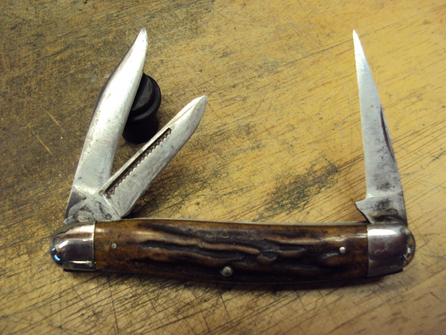 This Kabar is cool. I have never seen one like it before. The blades are well used up, but the stag is great.