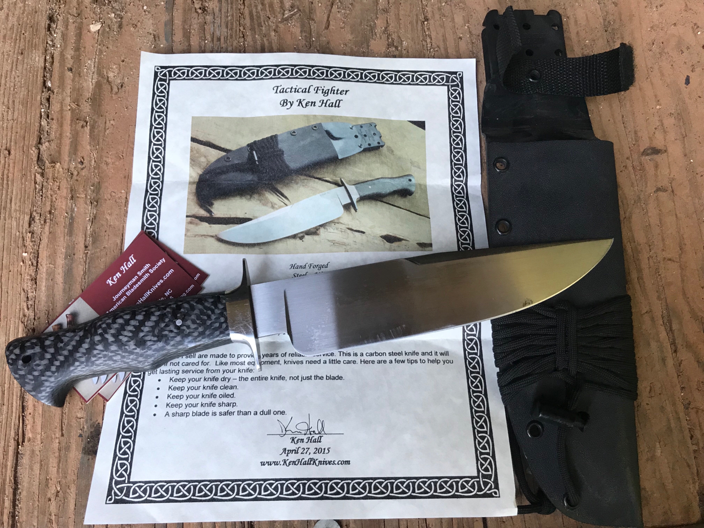 Up for grabs is a nice lightly use Ken Hall "tactical fighter" with certification letter and all. Features a Hand Forged W2, 410 stainless guard and solid carbon fiber handle. 13 1/8" OAL and 8" blade. Nice light Hamon. Has a few "user" scratches from the original owner. Just dont need this one