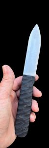This is his bigger brother, same steel, thickness, ht and temper, but with scalloped (jigged) g10 scales. Cutting edge a half inch longer than the first.