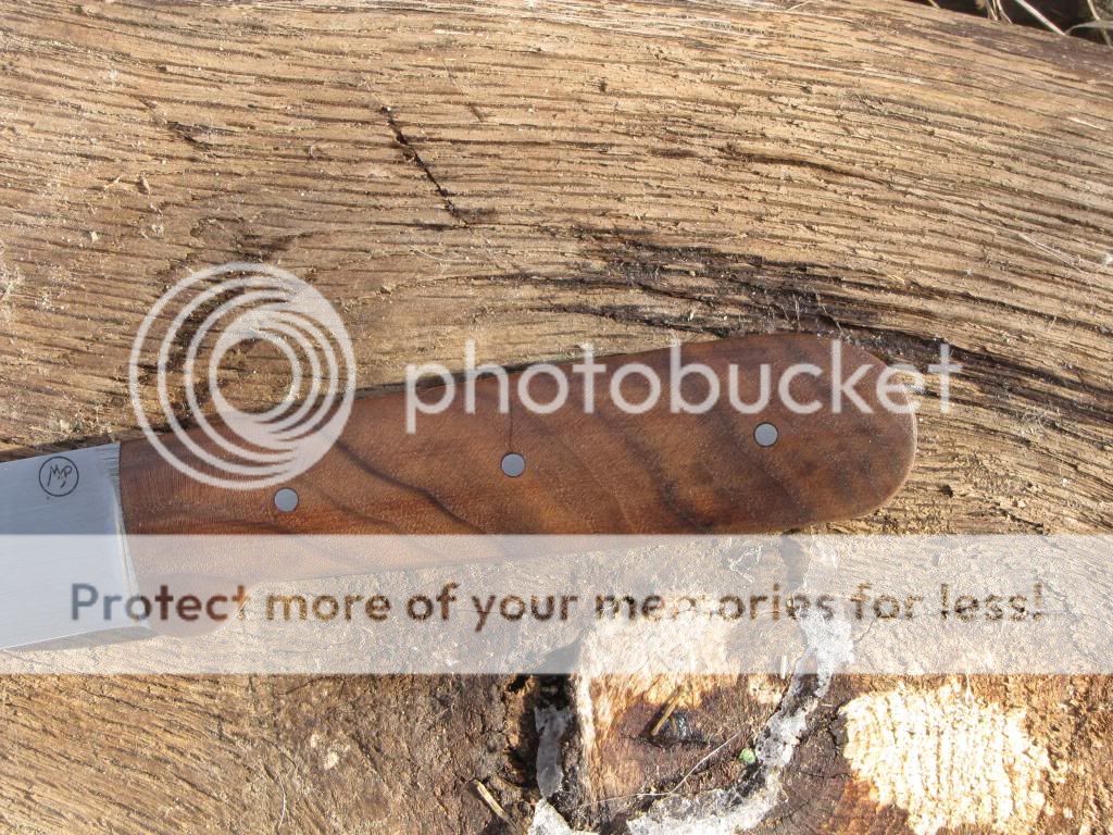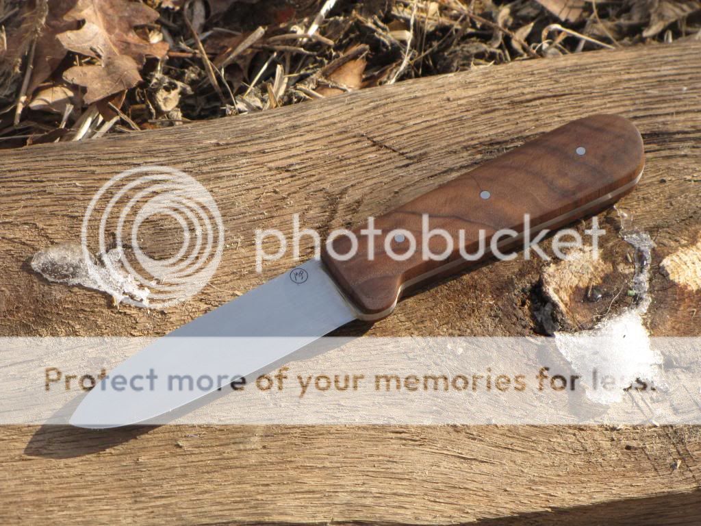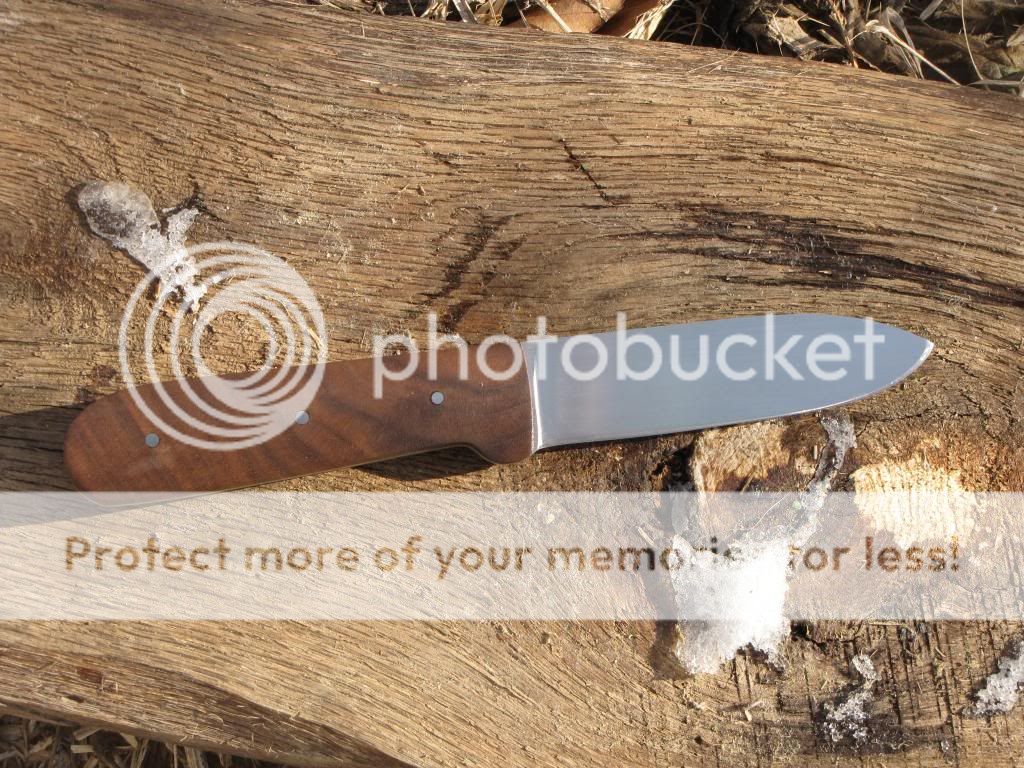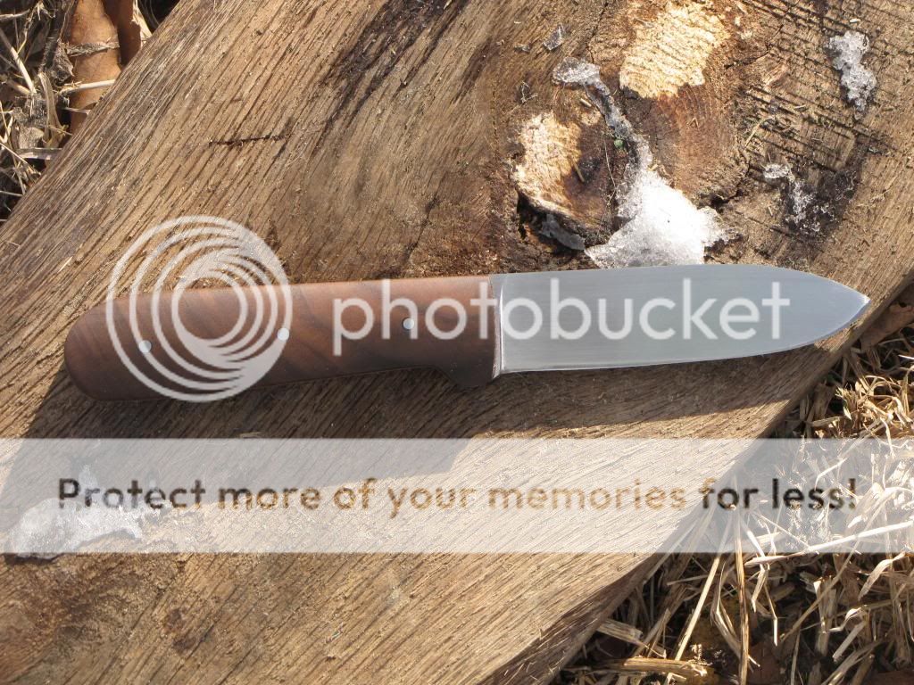 This is a Kephart in 1095. The blade is 4" long and 1" wide. Handle is 4 3/8" with walnut scales held on with G-flex and stainless pins. I heat treat on site in an EvenHeat Kiln. Quenched in Parks 50 to an RC of 59-60. I soaked the handle with Linseed oil then finished it out with three coats of Tru Oil. There is a small crack at the second pin that you can see in the pictures that has been fixed with superglue. Therefore this knife will be sold at the discounted price of $125. Comes with right or left hand leather sheath.