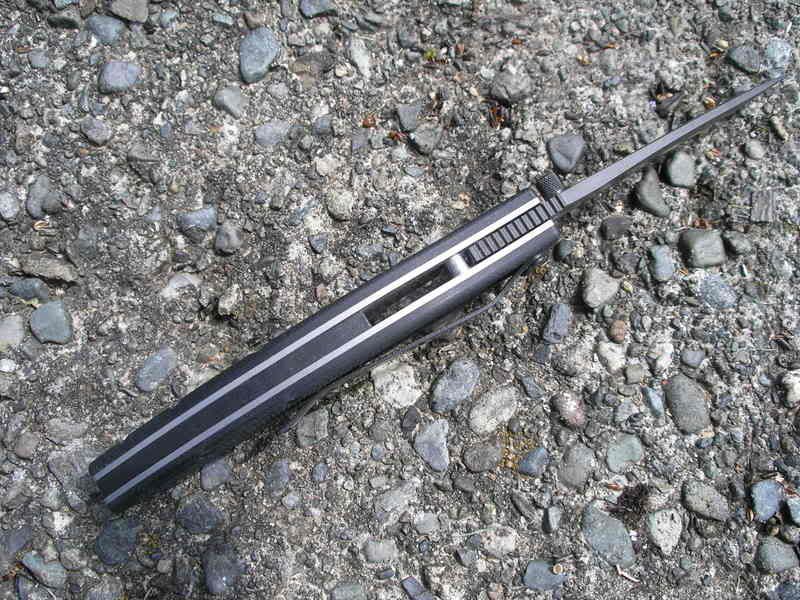 The second thing you may notice is the black (TiNi) coated blade. The coating is 'fairly' resistant to scuffs, but I did polish it in a couple of spots by cutting cardboard. Aside from the occasional scuff, the coating appears to be very resistant to scratches.