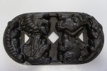 VINTAGE CAST IRON DINOSAUR PAN: Cast in the USA in 1986 by John Wright Company. Features six different dinosaurs. There is some minor rust present in a few areas, but could likely be cleaned up with a more knowledgeable person. Measures approx 14.25'' long and 7.5'' across the center. Neat collectors' piece or usable kitchen addition for perhaps making goodies for the kiddos in your life. $60