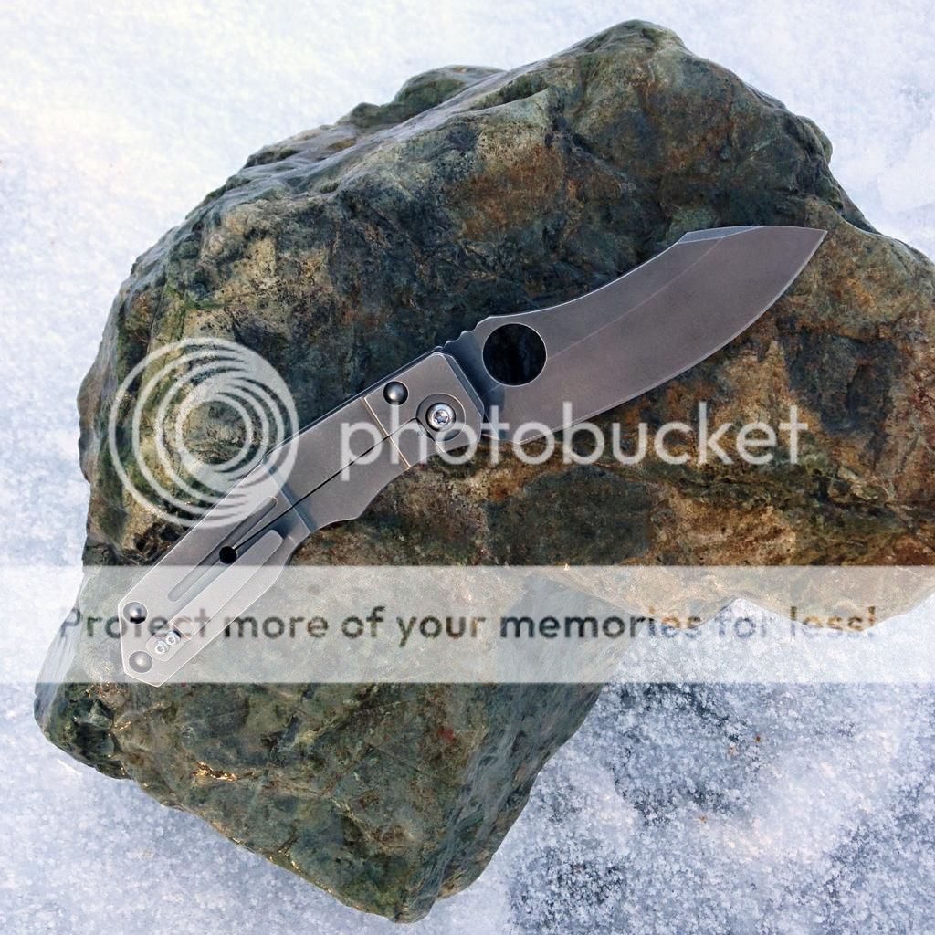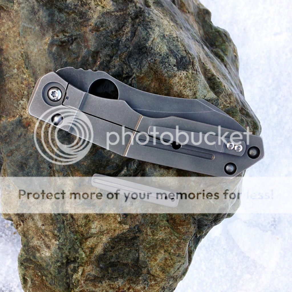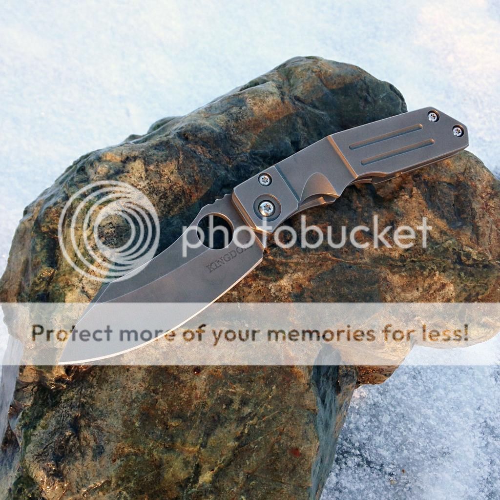 Fresh from the spa, lightly used Kingdom Armory Large Samaritan Custom. Only two like this and Daves books are closed as you know. This baby flips right open using the Spydie hole and has rock solid lockup. Blade is nice and sharp acid washed S30v. Blade is about 3.75 and total length is right at 8.75. Nice velcro pouch included. Has new clip on it now just made by Dave at KA. It goes into the pocket a little easier than the original clip (also included). As an extra bonus, Dave also installed an upgraded ti backspacer instead of the standoffs that it had originally.