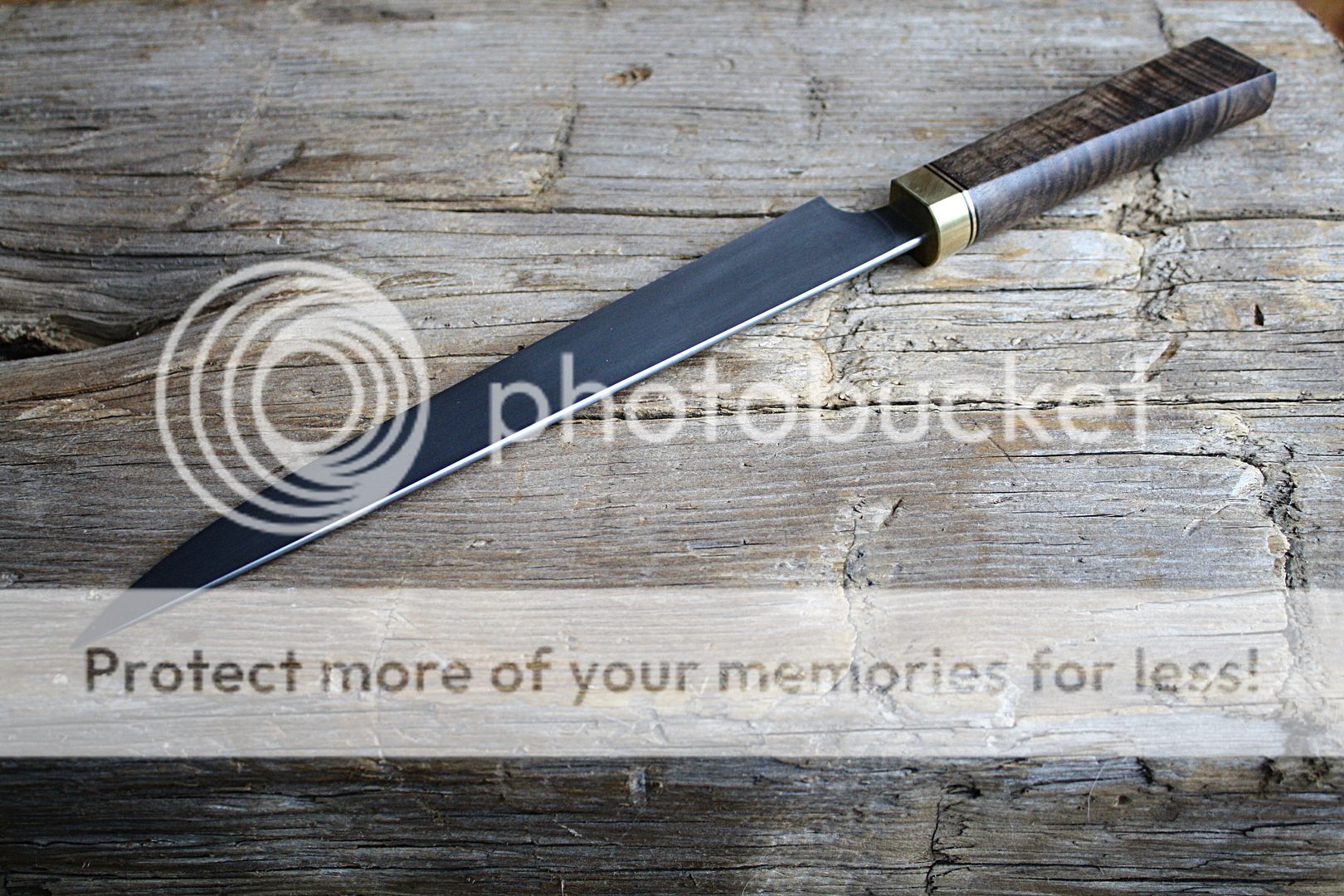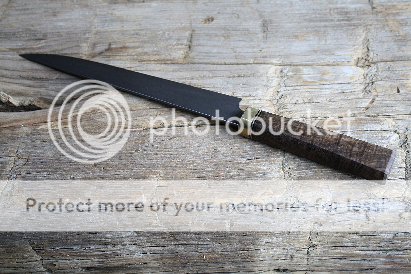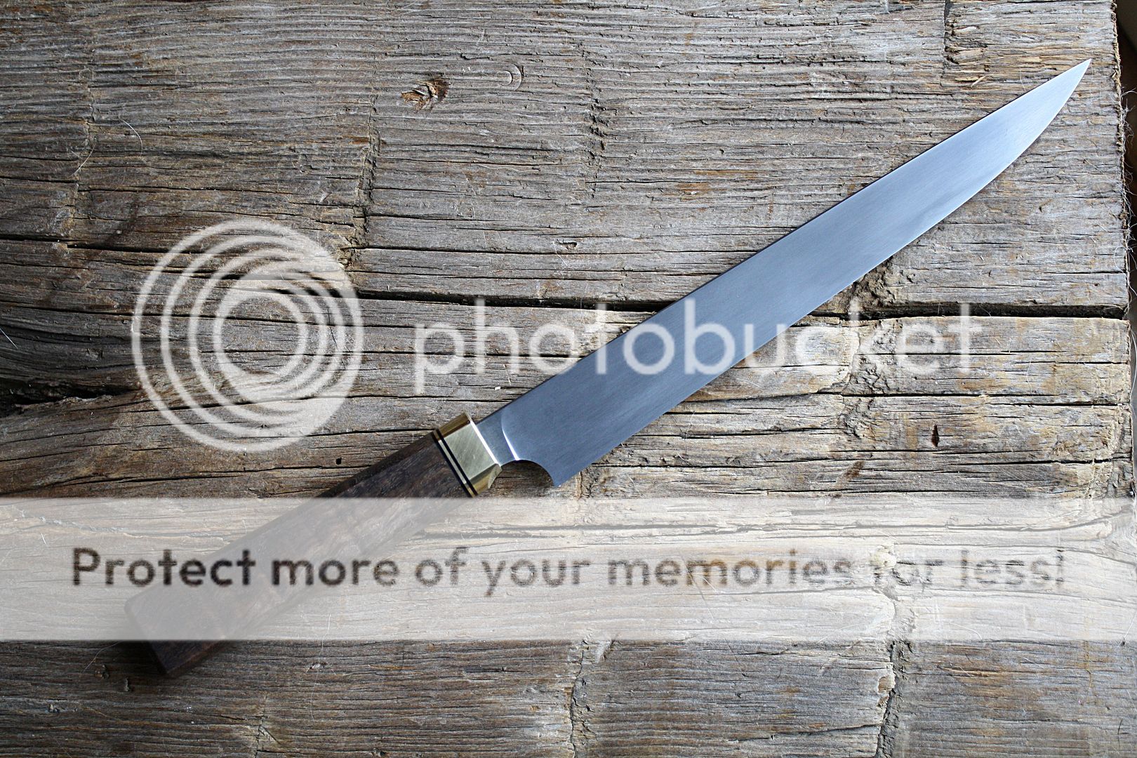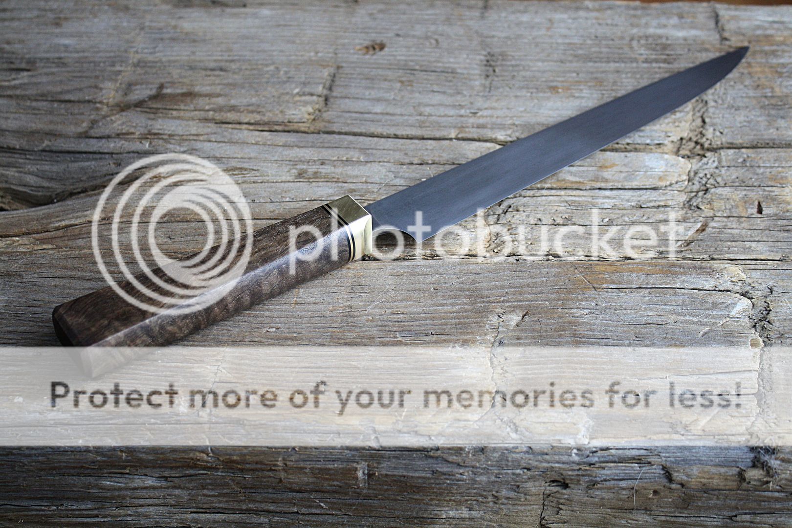 This is my latest finished knife, aside from still having to putting an edge on it. I've been pretty interested in kitchen knives lately and this is my 3rd one, also my second hidden tang. I'll be the first to admit I pen the front of the bolsters because I still haven't been able to get them compltly perfect and to my liking.. or I'm just being really picky. I'm all ears for suggestions and comments and critiques, thanks for looking.