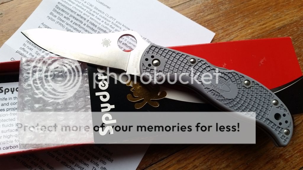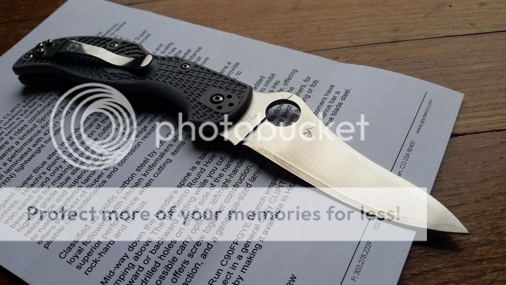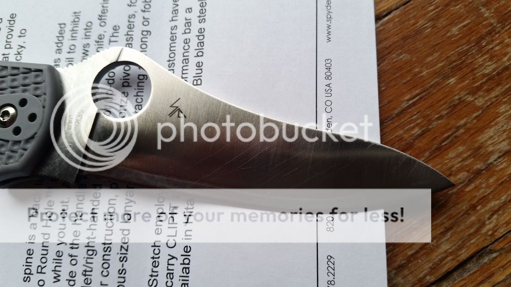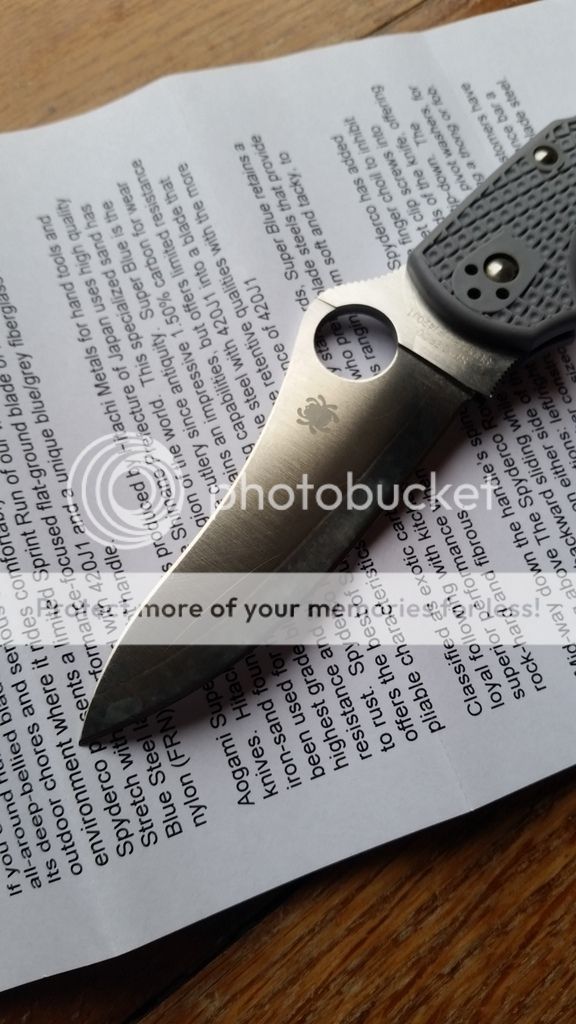 Next, a Spyderco Aogami Super Blue, 420J1 laminate Stretch. This one has been used and carried. Handle is in excellent condition. The blade does have some user scratches that I held in light just right to capture best I could. There is a slight patina from cutting a couple of apples. It is Very sharp though. I have sharpened on a Spyderco UF benchstone and stropped with .5 diamond spray. IT IS SHARP! $85 [SOLD] (PayPal F&F or add 3.5%), shipped USPS Priority CONUS ONLY PLEASE. NO TRADES!! First "I'll take it" followed by sending me a PM or email [gstrader73@yahoo.com] promptly please.