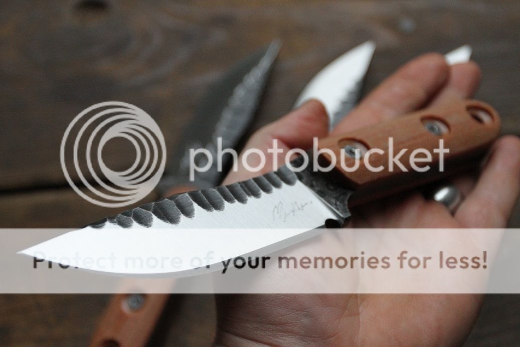 i haven't done "knapping" in a while so thought i would try it out once more All SOLD Blade 4.125" 9" OAL 52100 steel 58-59RC .25 thick natural micarta scales with stainless hardware stonewashed knapping and satin bevels SOLD shipped with kydex sheath