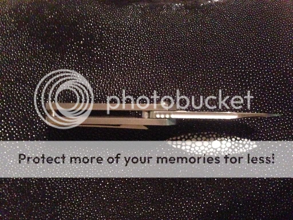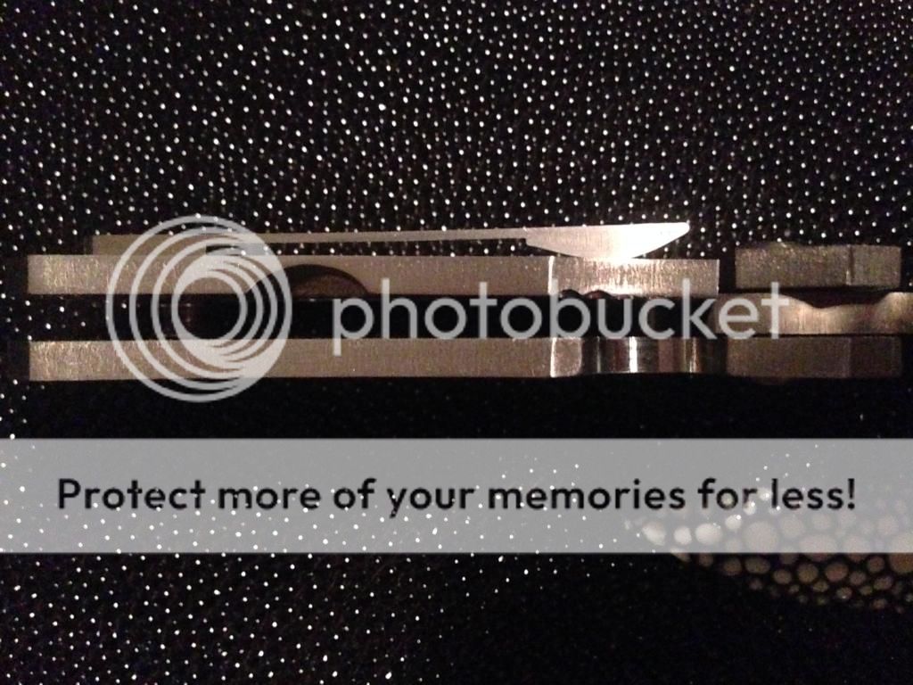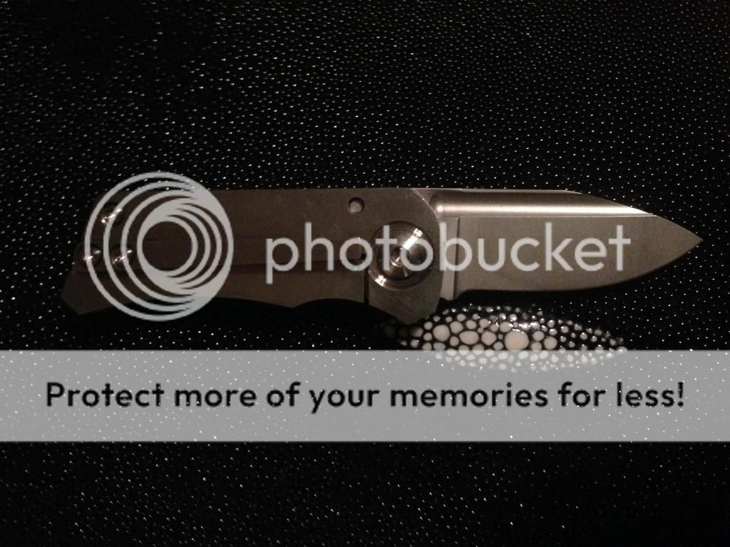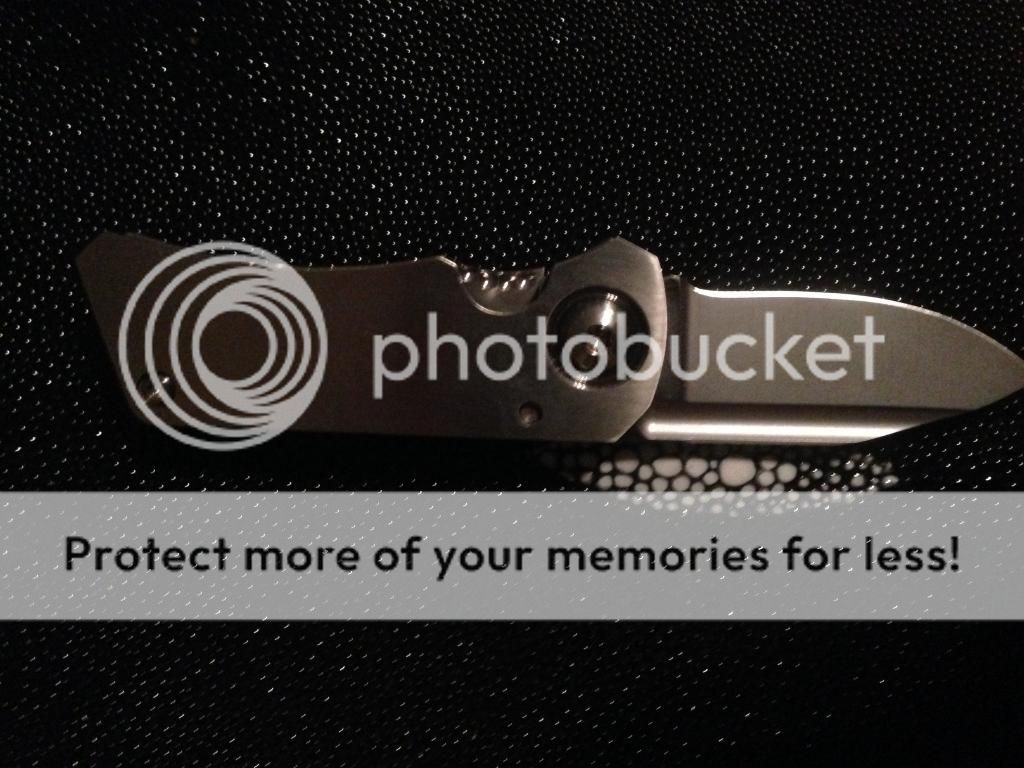 Small titanium Frame-lock with milling to the blade (fullers on both sides and grooved top with hole jimping and pocketing to the inside of the handle to get rid of excess weight, comes right hand tip up carry cpm154 blade with bead blast finish. Lock up is solid and centering is pretty good. All titanium torx hardware, standoff and pocket clip with 416 stainless pivot and stop pin. HT was done by Peters HT TO 60-61.