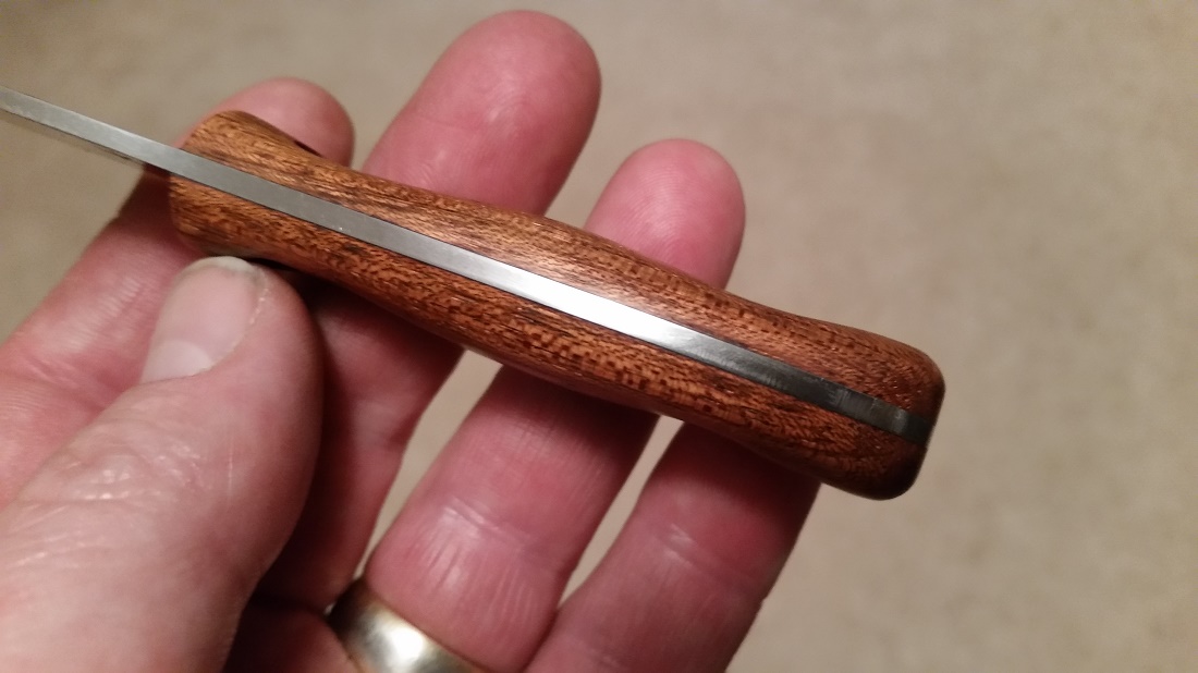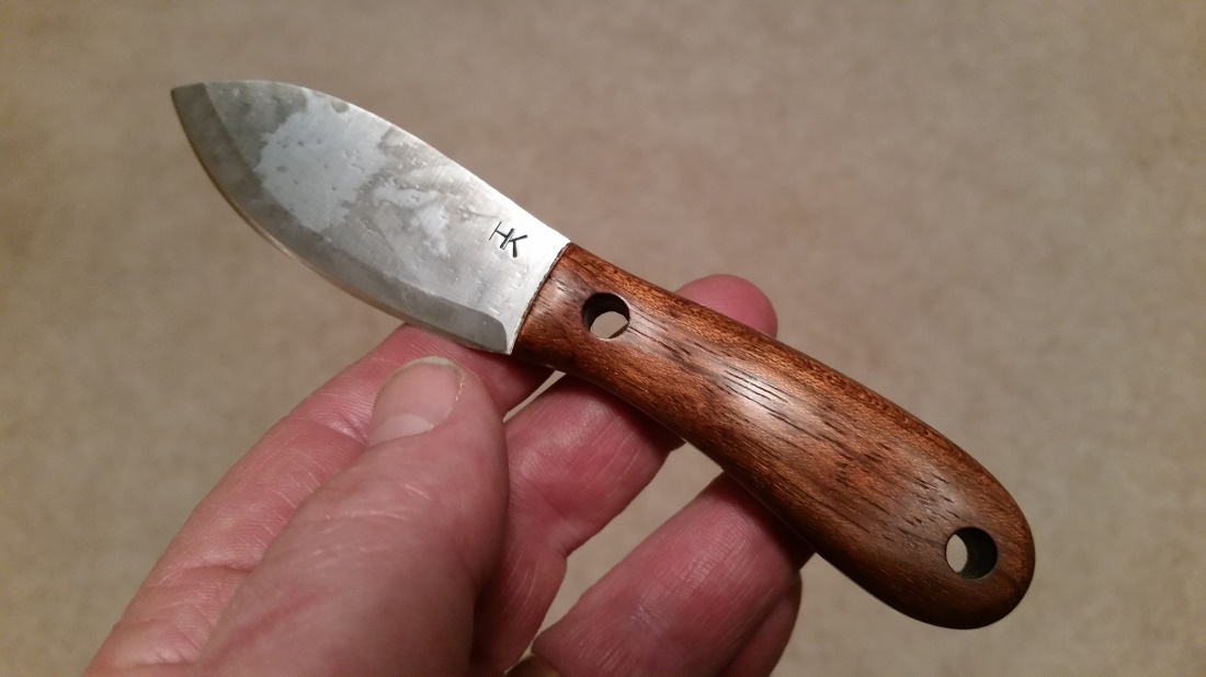 An HK Mini Muk blank that I picked up here on BF a few weeks back. One of my first attempts at handle making. A small piece of Jatoba from a coworker... I'm happy with how it turned out. It makes a nice little EDC.