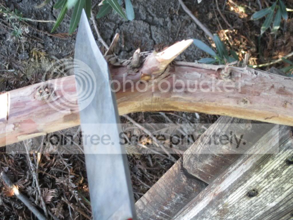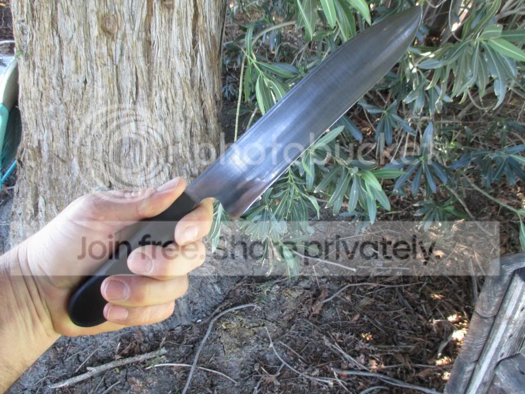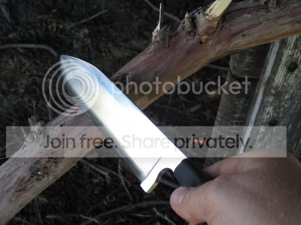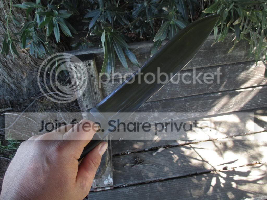 I slipped, and hit the edge with the chuck. Made a pretty nice chip, and chewed up about 3/4" of the edge up. Nothing I couldn't fix though, but my edge itsn't as straight as RJ's was. It wasn't my best day at the grinder, that's for sure, but it'll eventually get worked back to a straight edge. Still nice and sharp!!!