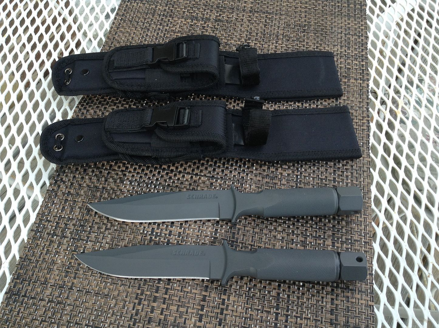Last are a couple of a Schrade hollow handle knives. I don't know much about these as I got them in trade but they are unused. One is missing the tools inside the tube, one is not. Both have the factory sheaths. --Both Sold--