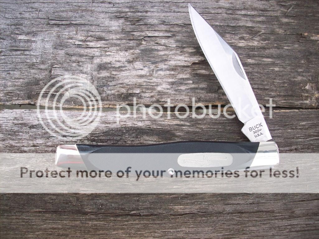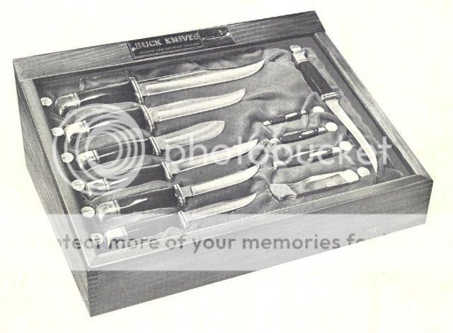 What did Grandpa carry ?, consider this. Its a picture of Bucks first store display cases. And I bet a dollar to a donut that Grandpa bought his pocket knife out of one. Later, the blank space either held a 307 large stockman or a small two blade 309 model. For the folding knives bottom to top its, 110, 301,303 and 305.