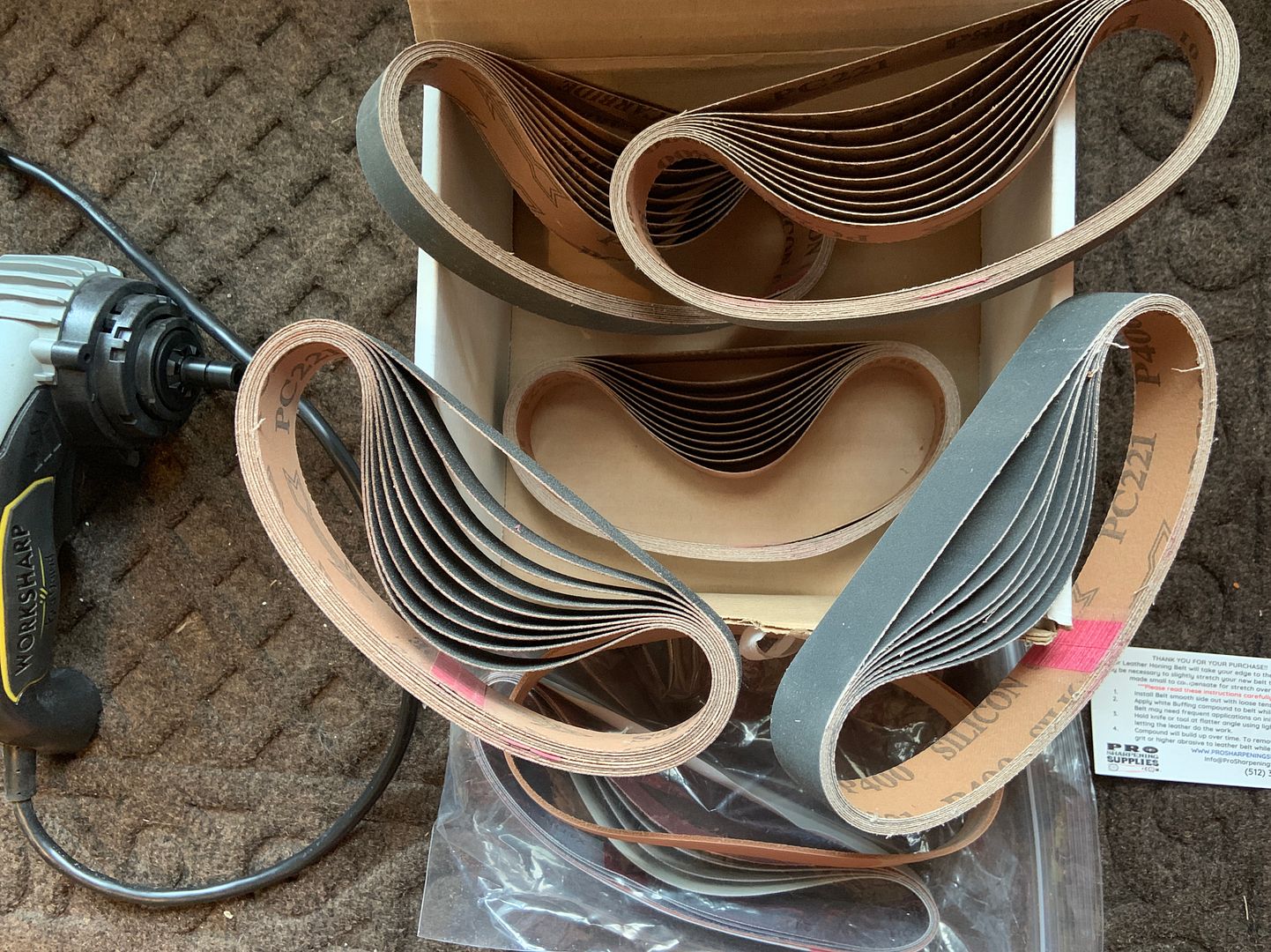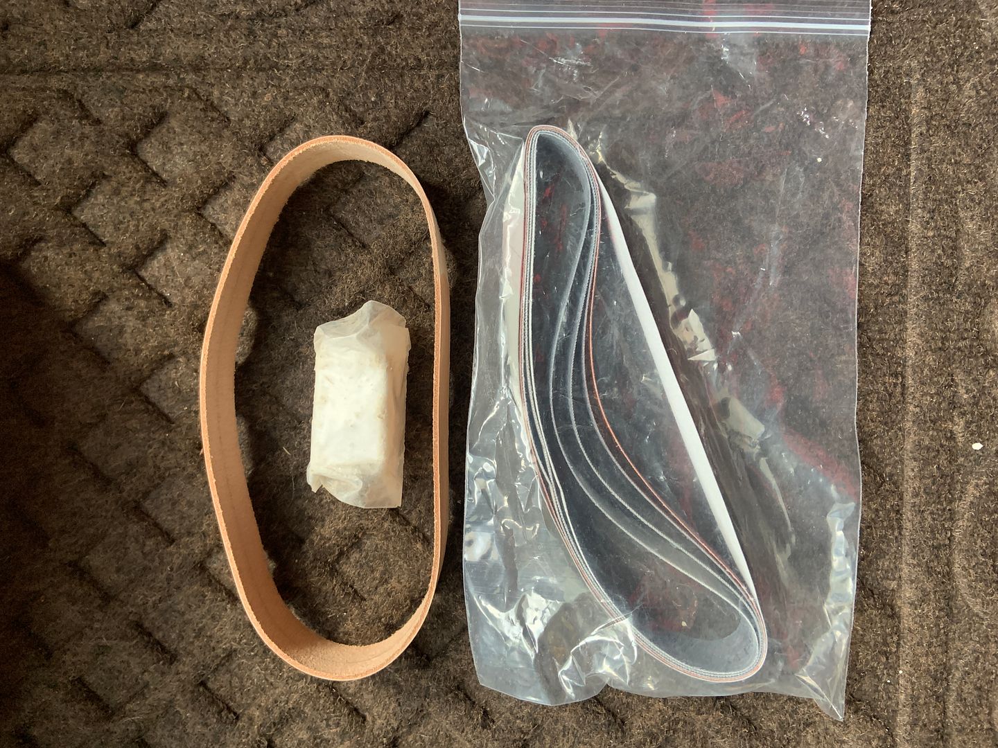 The belts include 120, 400, 600, 800, 1000, and an unused leather belt with compound. The Norton belts that come with the grinding tool were never used and will be included.