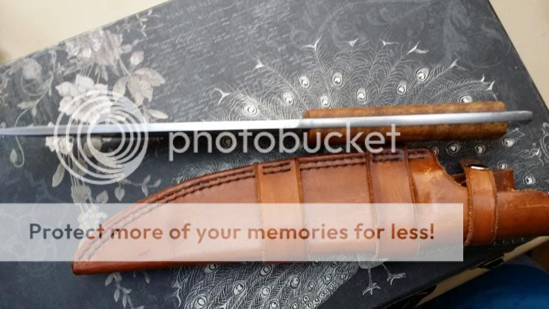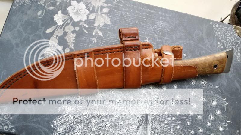 It has a convex blade and comes with the sheath shown in the pictures. I had it made with an exposed tang to my preference so it is unique in that respect.