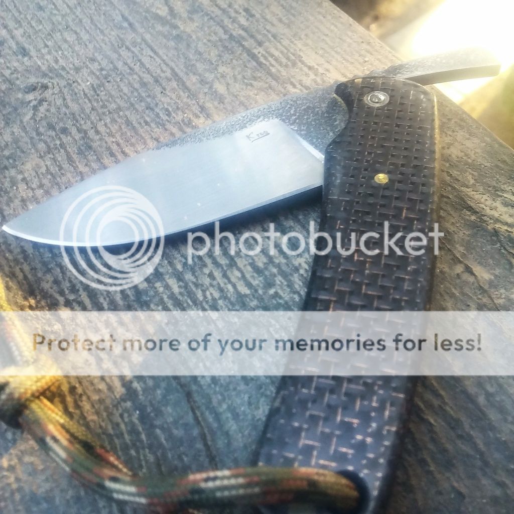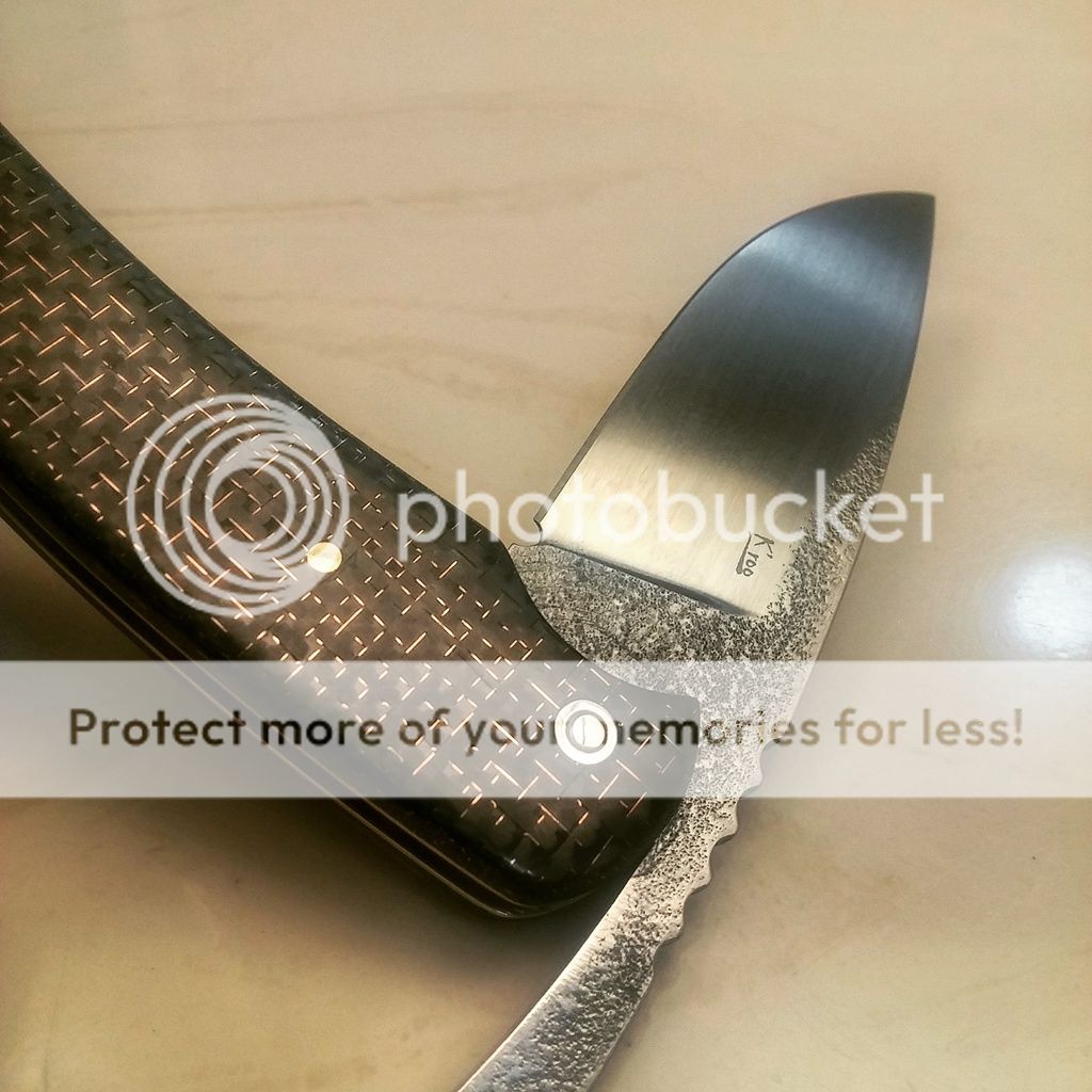 Kroo knives custom friction folder. 3" blade, N690 blade steel, brut de forge finish, lightning strike carbon fiber handles (brass twill) brass pins, brass liners. Asking --150 -->$125 PayPal. Con US preferred.
