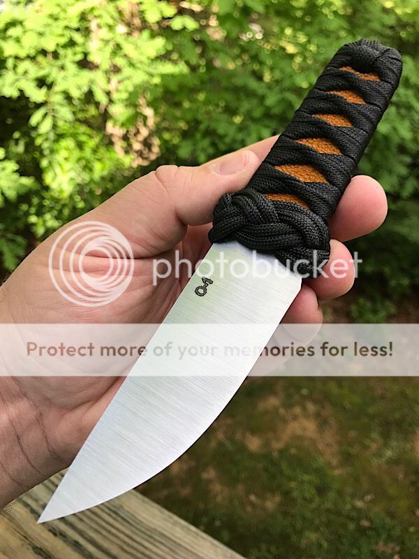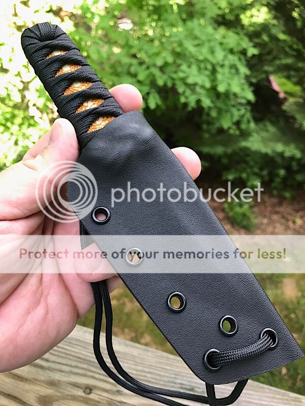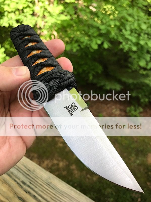 Black tsukamaki handle with an awesome genuine row stingray skin. This one was labeled as "cognac". It's a nice dark squash yellow.