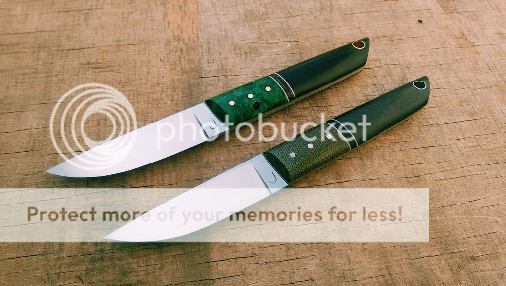 Scales are stabilized burl and G10 and brass hardware for top. Bottom is olive micarta and carbon fiber with aluminum hardware. Both have white spacers and liners.