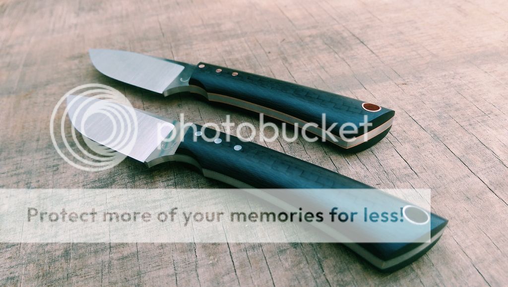 Scales are carbon fiber and white G10 liners with aluminum hardware (copper knife is SOLD)