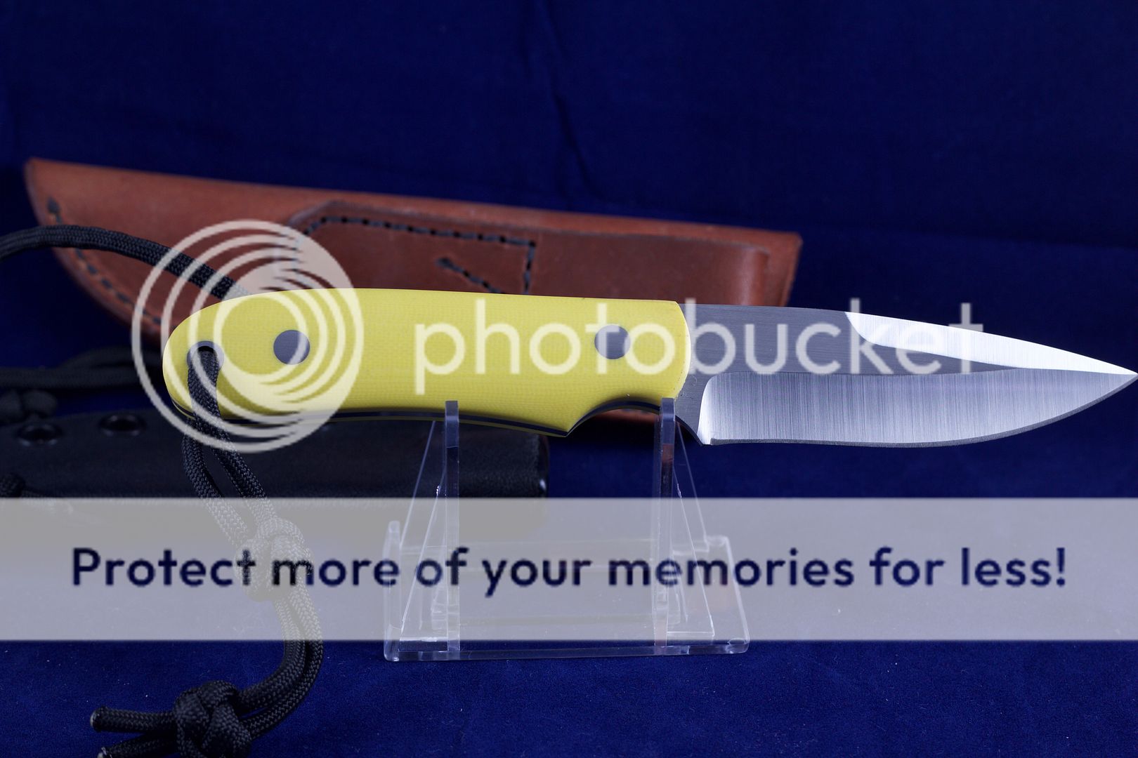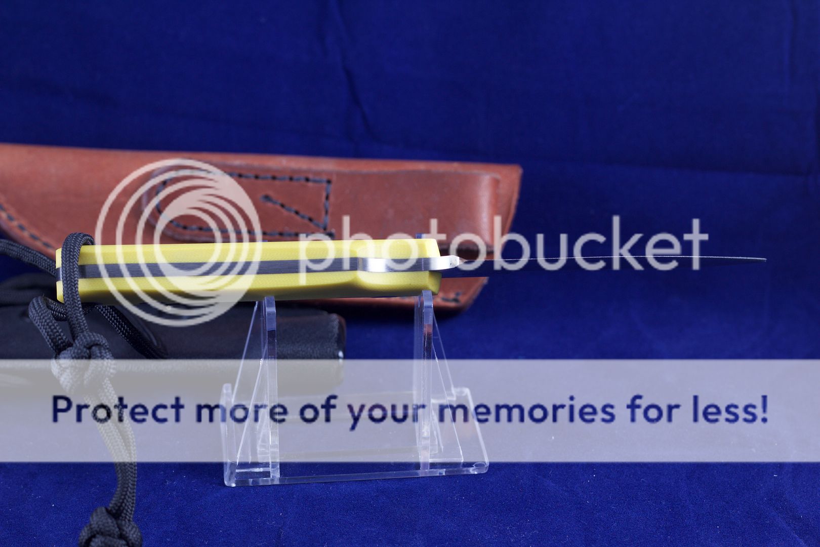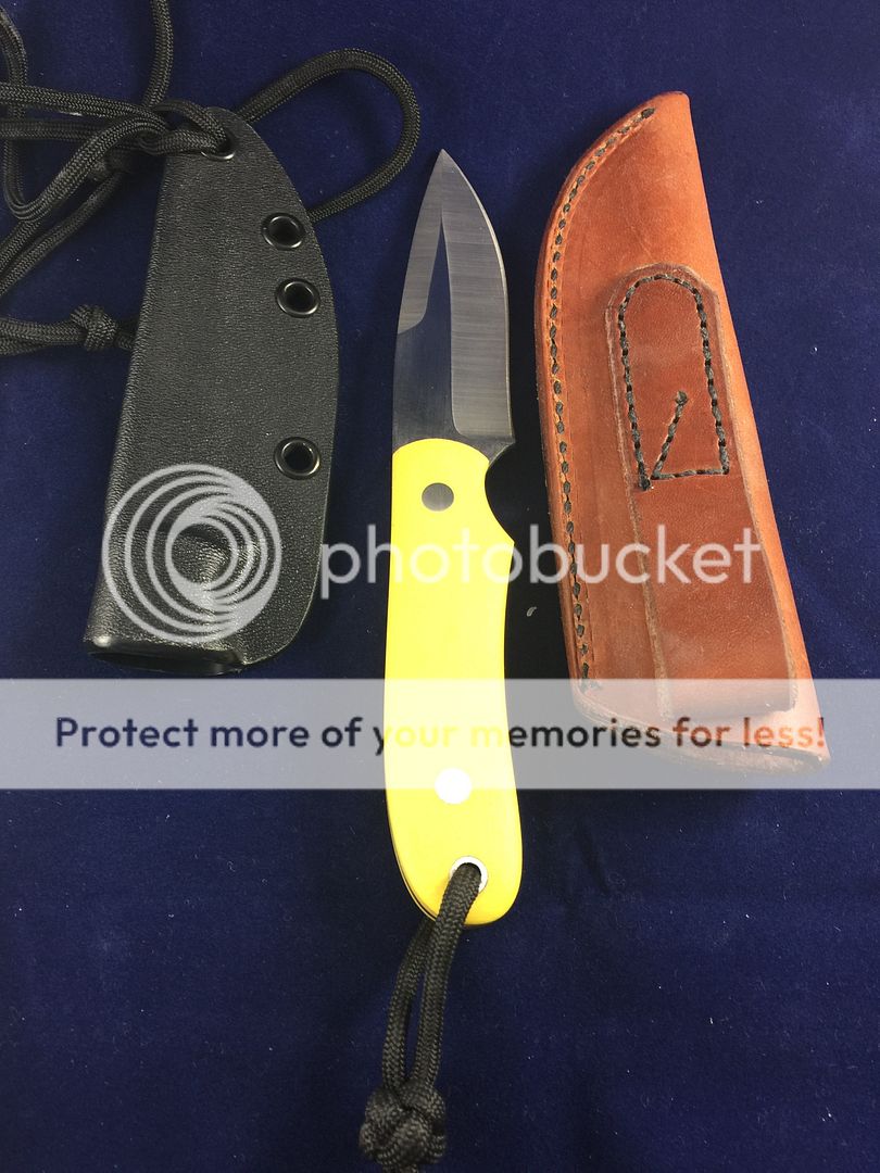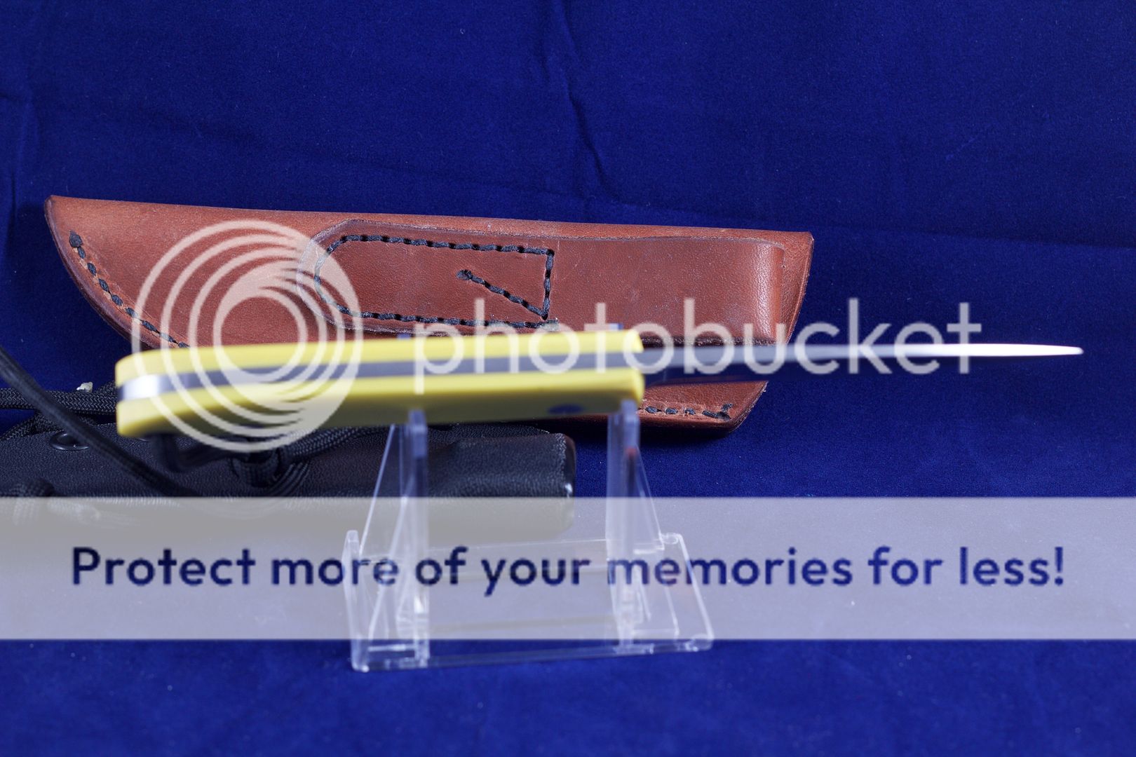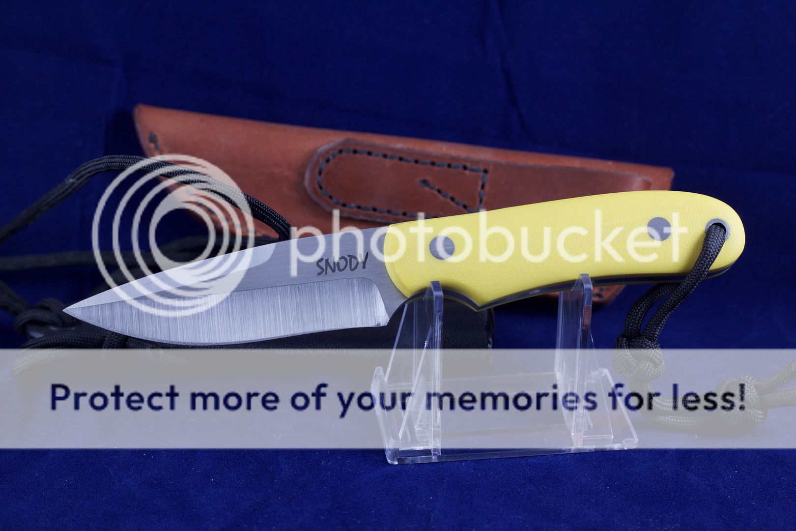 For sale is a Snody Menace in Lambo Yellow. It has never been carried or used, purchased by me directly from Snody Knives in September 2009. It includes both the leather and Kydex sheaths.