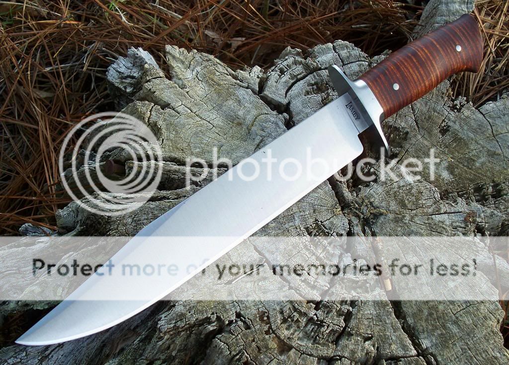 This is one of Matt's working bowies. It has a belt finish and a couple of forge marks, but it's a great knife. The blade is 11" of 5160 with a sharpened clip and the handle is dyed maple. The only reason I'm selling it is that I have to put a new carb in my truck. The price is $550 $500 $PF, which includes insured shipping and paypal fees, and is less than I have in it.