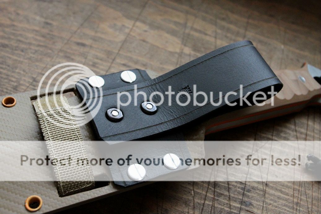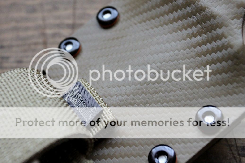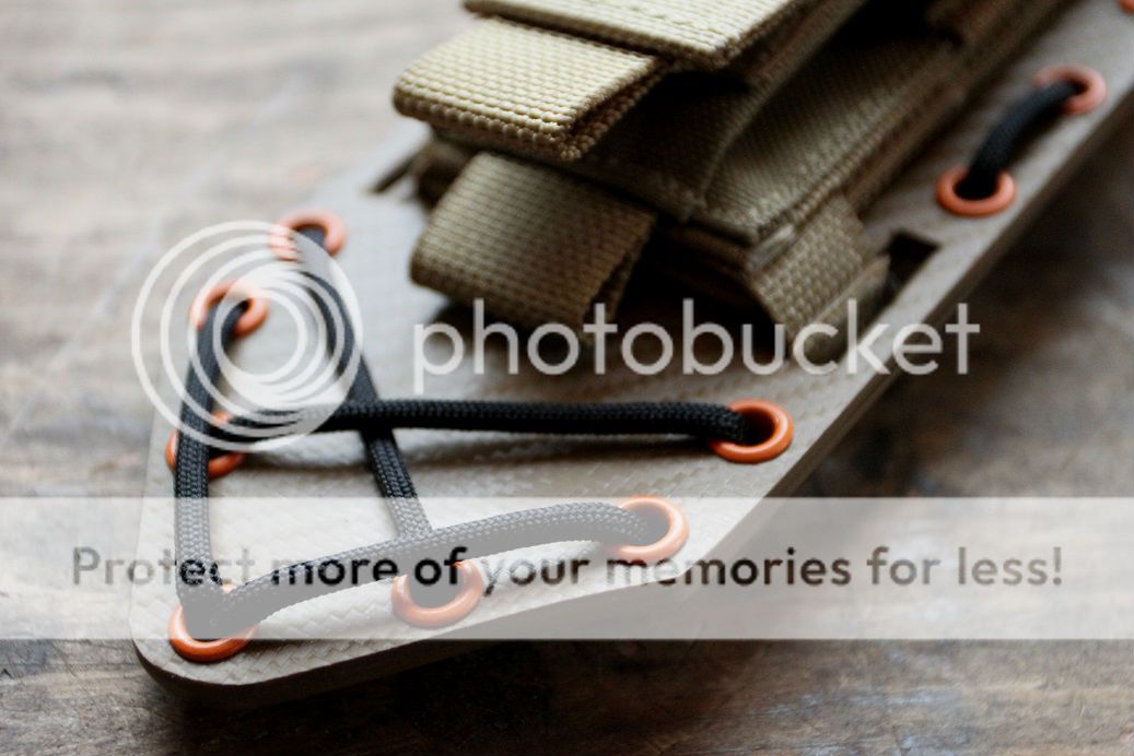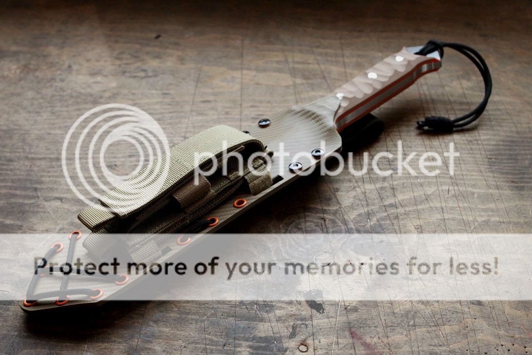 the sheath was made to match with black, aluminium and blaze orange hardware. the main sheath is carbon fiber patterned holstex with premium black buffalo hide straps, with a maxpedition MOLLE pouch for your sharpening stone, extra mag, paracord or anything you can think to put in it.