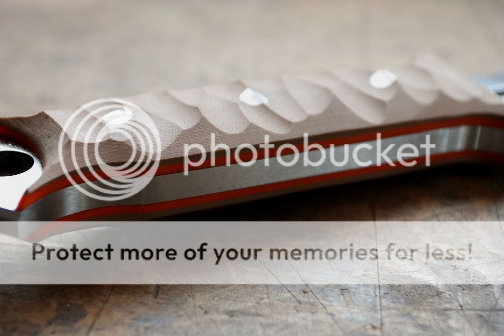 The handles scales are made from Coyote brown G-10 and G-10 blaze orange liners held in place with 20 ton epoxy and 3 peened .25" aluminium pins. the scales are done in a random rock pattern.