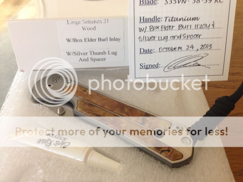 For sale is is a beautiful large Sebenza 21 with box elder burl inlay. I am the second owner but it is basically unused. Any use has been minimal. Very sharp factory edge with perfectly centered blade and about 50 percent lock. I have never carried it as it is just too nice for me to carry. Figure to pass it along to someone that will use it. Deployment is extremely smooth. Comes with original box along with Allen wrench,tube of grease (unsure how much is in tube) and leather sleeve. Price is. SOLD (PP gift or add 3.5% for goods/services). usps shipping is included.