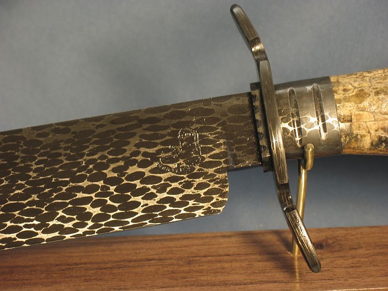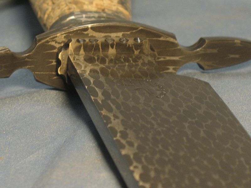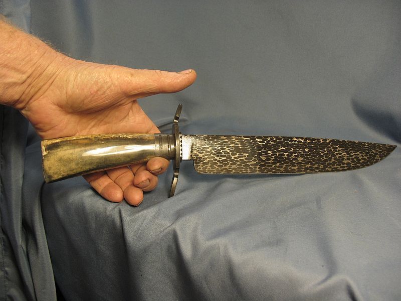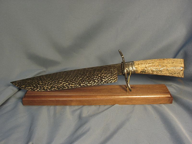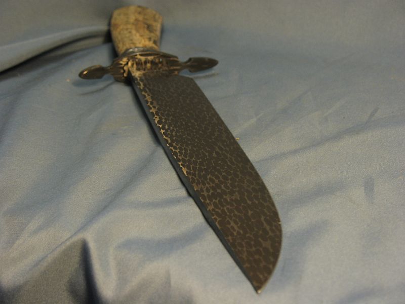 Hello folks. Here is a snake skin Damascus knife which is made out of 1/8th inch ball bearings and 4800 KC steel. All fittings are snakeskin Damascus. Makes for a hell of an edge holder so its not just about the looks. Ball bearings are very high carbon steel made to be tough. There are alignment pins in the ferrule and handle. The handle is one of the best I have ever received and has a natural end as it came out of the ground. One side was face up to the sun and the other down. It has a crackle effect. It should be the best as I spent 275.00 for it. I made all the Damascus and the cost was about 100.00. It took 5 days to build. The blade that is 10 1/4 inches and overall is 15 1/4 inches. The blade is a 1/4 inch thick at the guard and tapers to point. Very comfortable in right or left hand. Comes with stand and I can have a quality sheath made for about 80.00 or more for in-lade snakeskin which I will have to get quote on. Hope you like it as I enjoyed making it. It is 600.00 plus 12.00 for priority mail. My paypal and e-mail is dangraves4923@earthlink.net