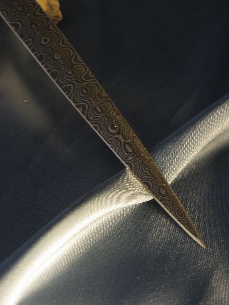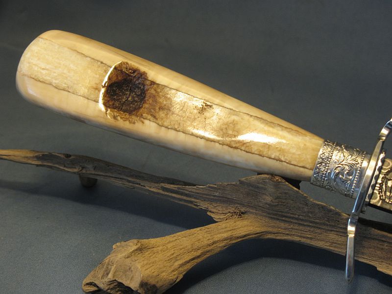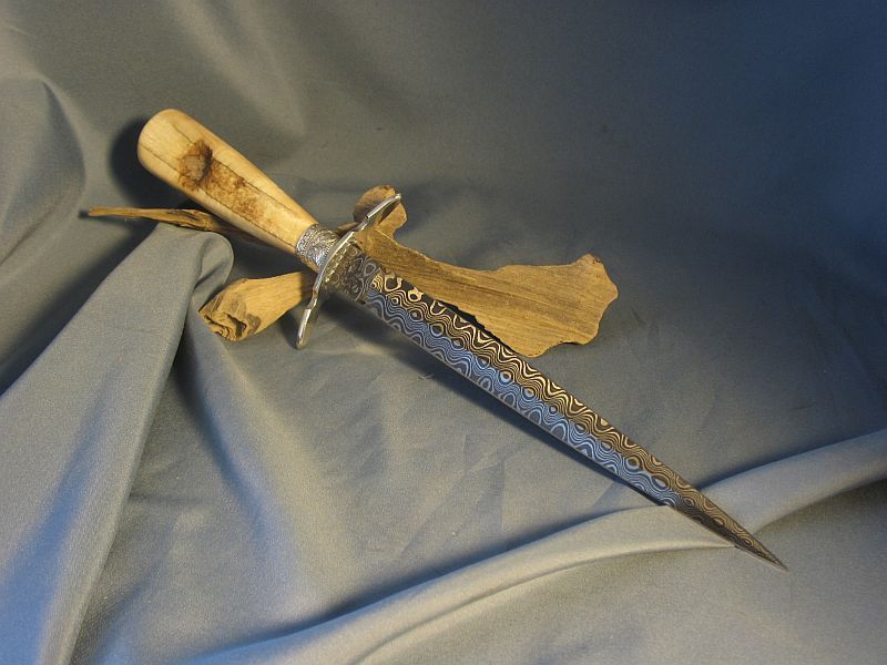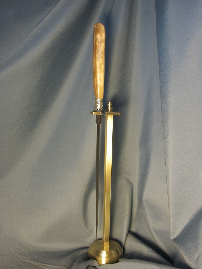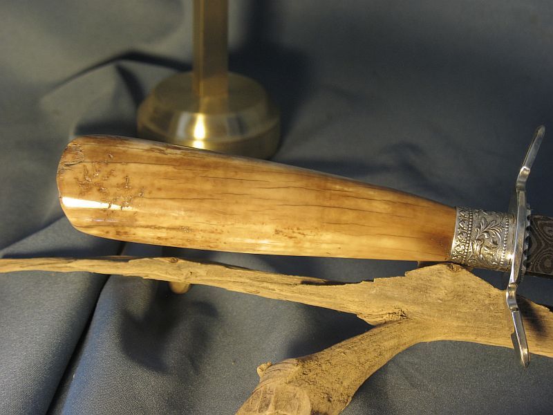 This is a much bigger dagger than I usually build and the artifact handle called for it. The handle is a ancient artifact that is a fire starter that is fossil walrus ivory. The handle was dug from private native lands by Inuit Indians on St. Lawrence Island off of Alaska. I did a little shaping on the end and there is a small part that is as it came out of the ground and the fire starter I did not touch. Fittings are nickel silver and sterling. I made the Ladder pattern Damascus out of 1080 and 15n20 steel for the blade. The dagger is ground from 1/4" thick billet and the Blade length is 9 inches inches long and overall length is 14 3/4 inches. The stand is made from solid stock of brass. After machining and sanding to a fine brush finish I coated the brass with a lacquer that prevents tarnish. It is heavy. The dagger is sharp and VERY pointy. This is one of my finer pieces. The set is "sold" and 15.00 for mail in USA address . My paypal is dangraves4923@earthlink.net Thanks and enjoy the photo's.