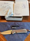 Large Sebenza 31 Natural Micarta S35vn. This has been my everyday carry for almost a year. Has been used but never abused. There are some snail trails on the scales. The blade has two marks at the tip, can’t find anything else but the stonewash on these do a good job of hiding anything minor . It has been sharpen by me on a Sharpemaker. Took it apart and polished the washers as well and I have to say this I had the smoothest action I have felt on a Chris Reeve. Only reason I getting rid of it is I want to try an Umnumzaan tanto (the only thing I would be willing to trade for) and the wife is really not keen on me have multiple high end knives. This is a great knife for someone looking for a really nice knife to use. Comes with all the factory stuff minus the two extra lanyards.