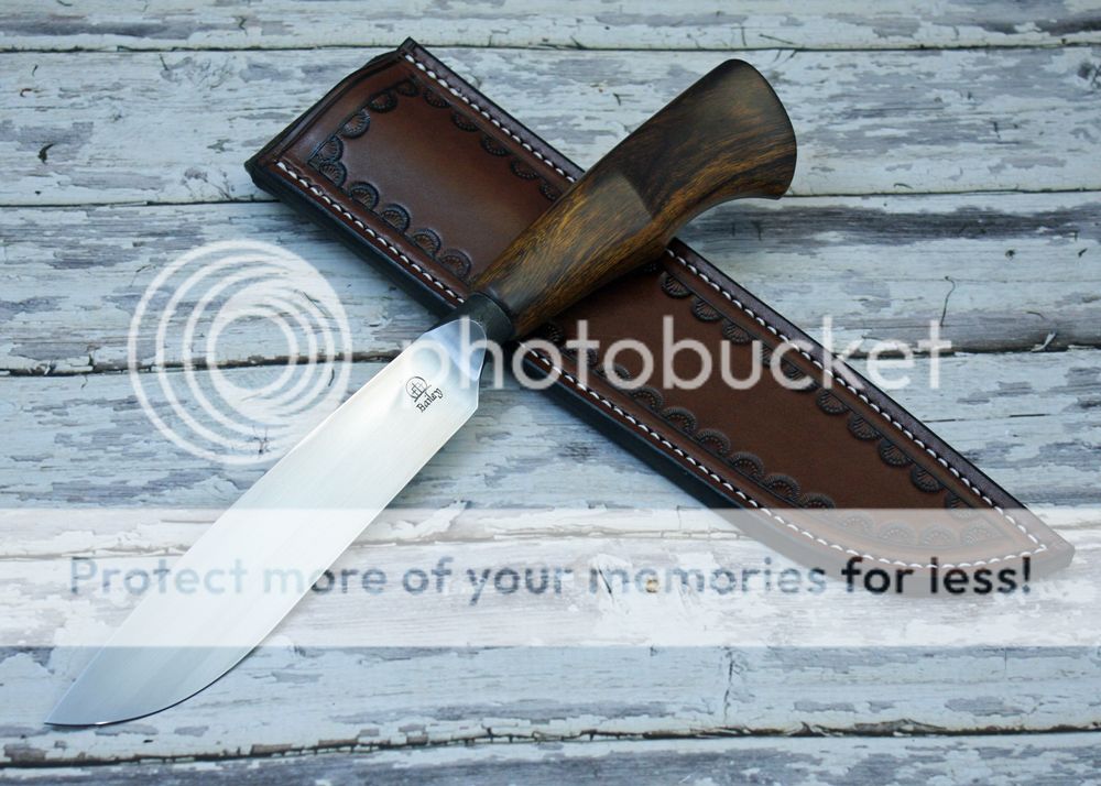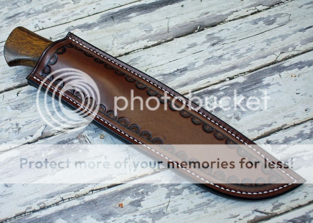 The sheath is 7-8oz hand tooled leather from Wickett and Craig. It holds the knife securely and draws easily.