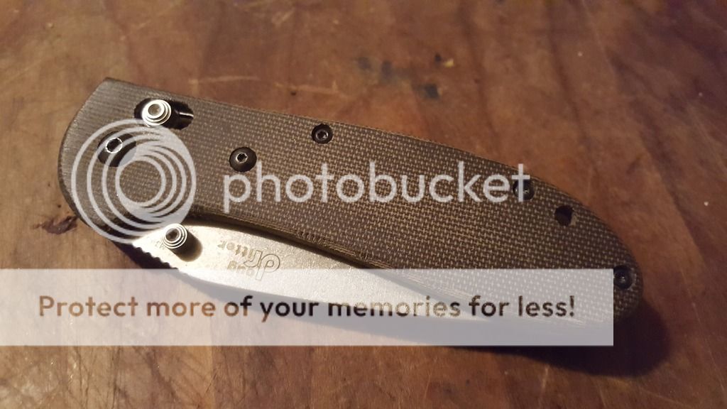 It's a Large Benchmade Ritter Griptilian with m390 steel and green canvas micarta scales by Igorded. Scales fit perfectly. Blade is centered and lockup is tight!