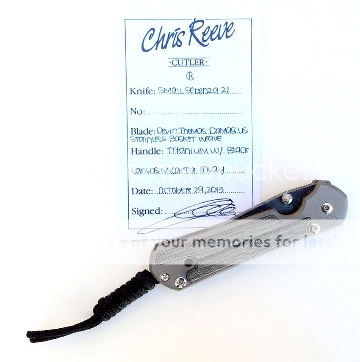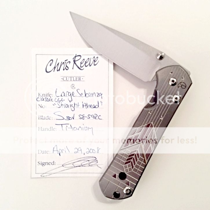 I have for sale a Large Sebenza Classic "Straight Ahead" graphic and a Small Sebenza Micarta in Basket Weave Damascus. The Large Sebenza I got in trade several years ago and I have not used it. It has some light snail trails and very minor wear marks on lock side. Blade is near perfect and shows NO signs of use. Looks like factory original blade edge.
