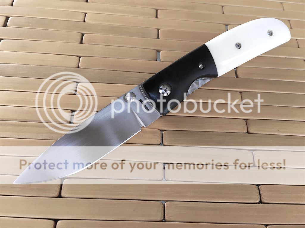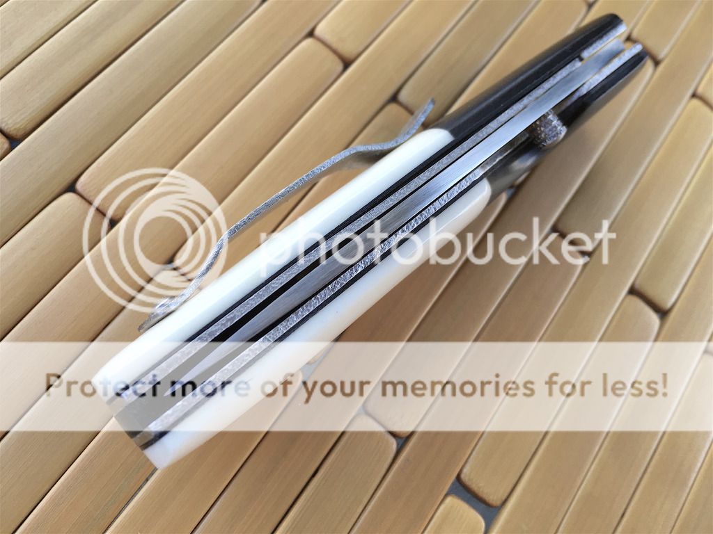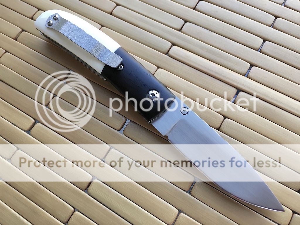 Uncarried and unused, this knife is a work of art through and through with attention to detail everywhere you look. Hand-rubbed satin D2 blade, titanium liners with jeweled interior and orange-peeled edges, knurled thumbstud, blackwood and smooth white bone scales, orange-peeled Ti pocket clip, pivot bearings for unbelieveably smooth and snappy opening, unused laser sharp edge, centered, locks up with no play.