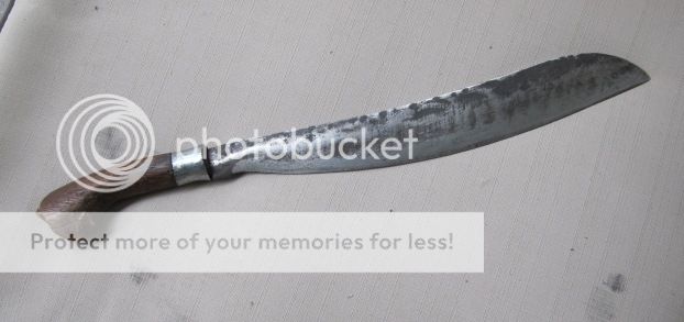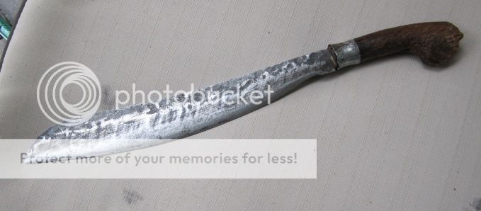Old parang. Carbon steel forged blade with a hardwood handle. It has am alumnium furrell. 17 in long OAL with a 12 in blade.