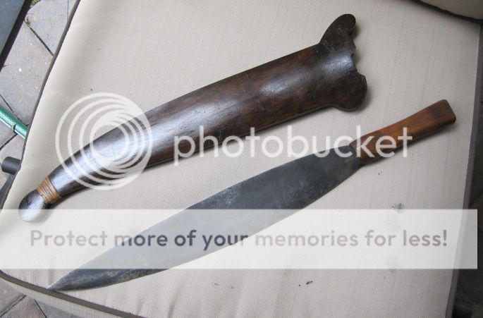 Barong. This one does have a sheath. It is about 3/16 in thick at the spine near the handle. A nice old blade. It appears to have been repaired. The handle is a light hardwood and cord wrapped. OAL is about 27 in and the blade is about 20 1/2 in.