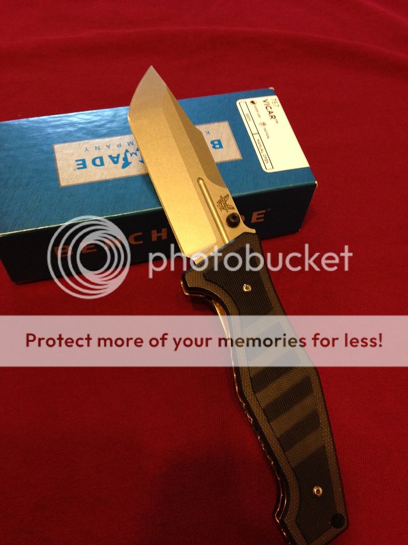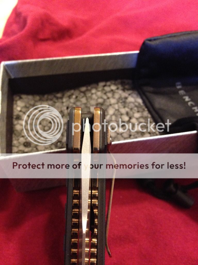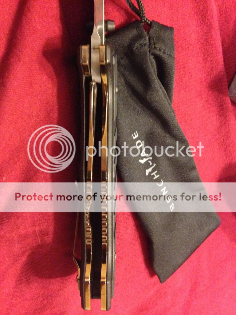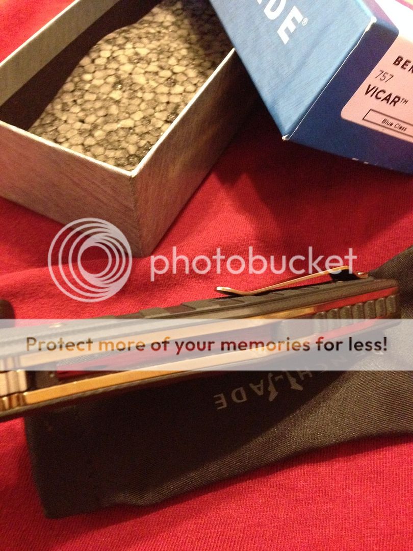 For sale (no trades please) is my lightly modified benchmade 757 vicar. It has had the original green g10 scales rit dyed black (looks great, better in person) and the titanium liners, pocket clip, and hardware polished.. The inside of the liners got a "jeweled" type swirl pattern (tried my best to picture) ..then everything was anodized gold. It shows very light signs of carry, as I carried it for around 3-4 days. Mostly on pocket clip, but again it's minor. Blade itself has been used very little on tape and a few envelopes, shows absolutely no wear and still has factory , sharp edge.