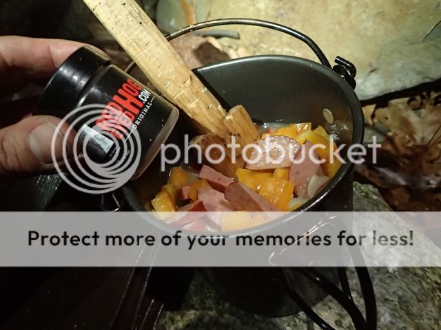 Jay and I took to the woods in New York for a cold (supposed to be rainy) night, with temperatures around mid-30s. Instead, it was sunny and cold, no rain in sight, but we had a blast and added two new items to our menu, replacing the regular Spam and rice or sausage kababs. Most of what we ate revolved around some seasoning from a friend in Alabama. Lately, Ive been using it on everything.