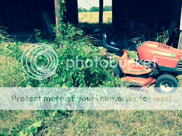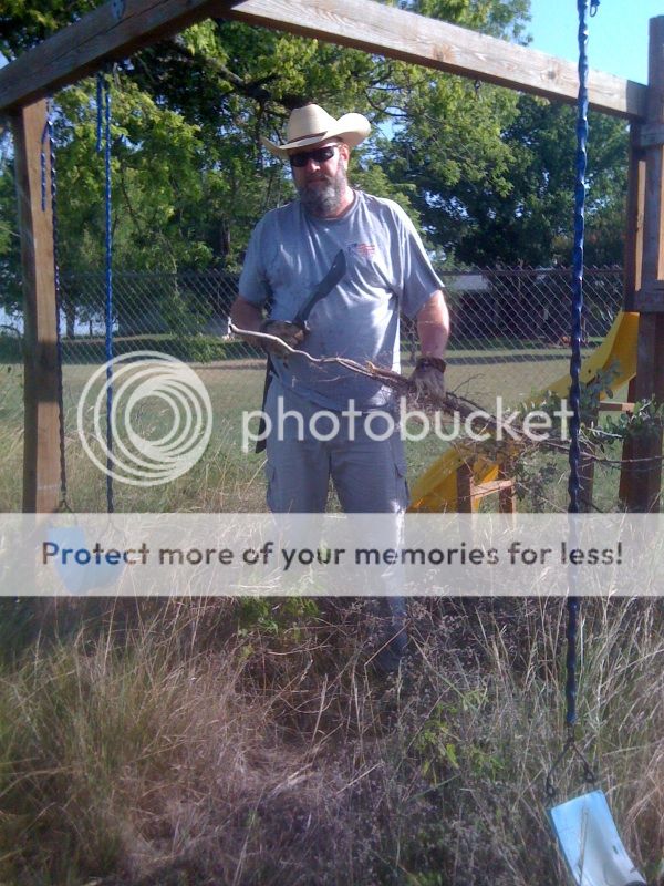 So one of my chores for the weekend was to get the brush that has grown up around the old swing-set (never used...it was here when we bought the place in 2005) so that my wife can start getting that area ready for a chicken coop. Here I am ready for work.