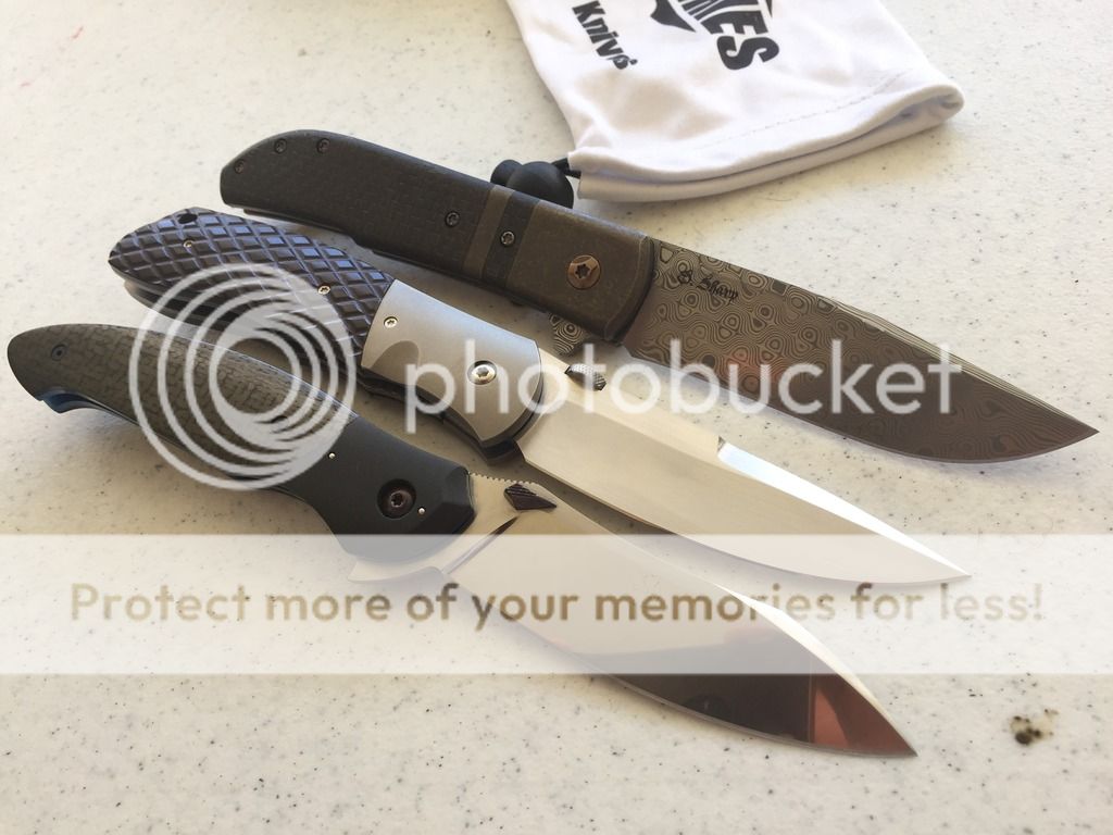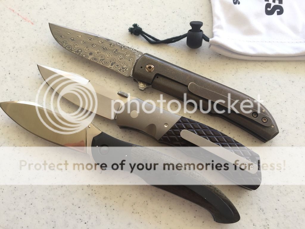 Framelock knife with CF scales and Ti bolsters. All hardware is titanium and anodized. Blade is damasteel. Action is super smooth on bearings and centering is spot on and lock up is solid. The damasteel shows some wear, but I'm sure a quick trip to David would sort that out.