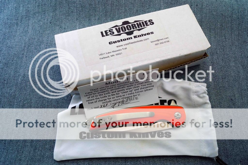 I purchased this Les Voorhies Model 11 direct from Les at the Badger show March of 2014. I carried it a few times, cut a bit of paper. Les's original edge.