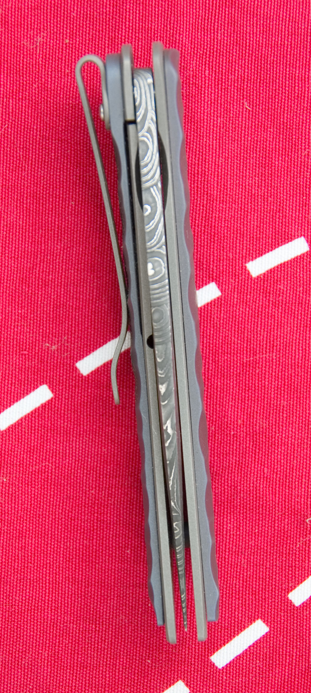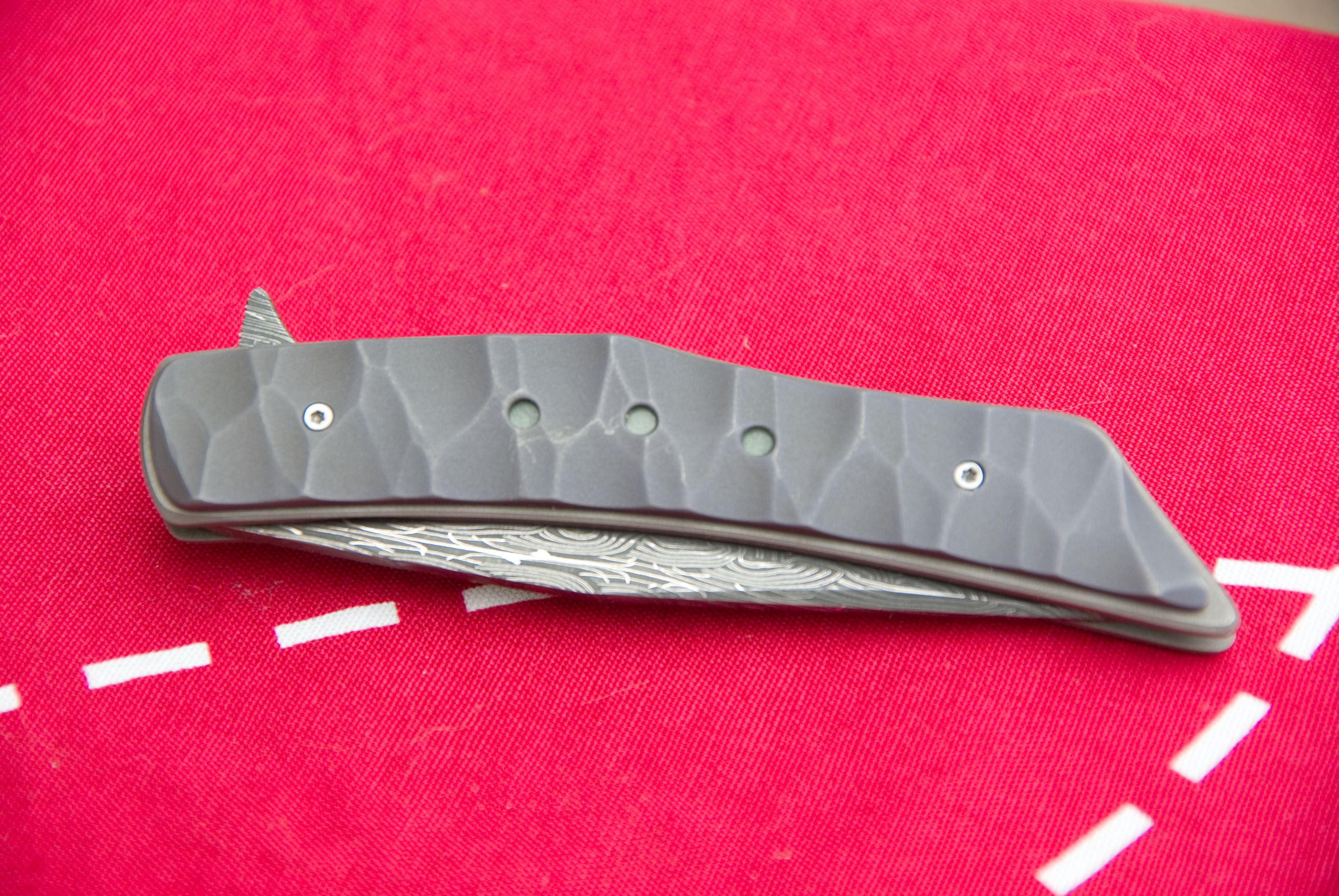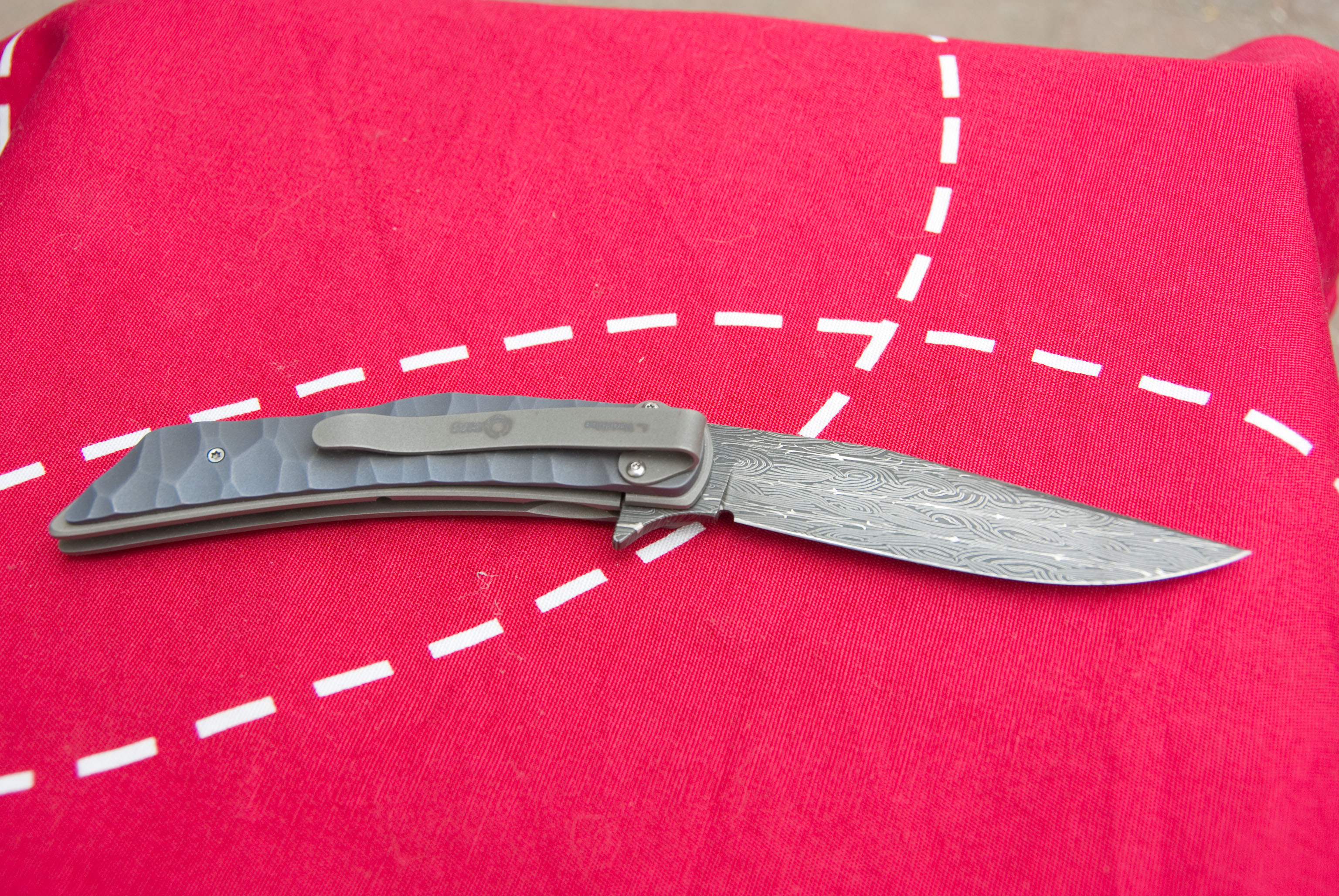 Les Voorhies one off Eggerling damascus flipper with glow in the dark inserts and nicely sculpted full titanium scales. Excellent condition with only a couple of light snail trails. No marks on the blade at all. The blade is 3.5" and OAL is a little over 8.2". Runs on IKBS bearings and the action is very smooth with a nice and strong lockup. The blade is centered.