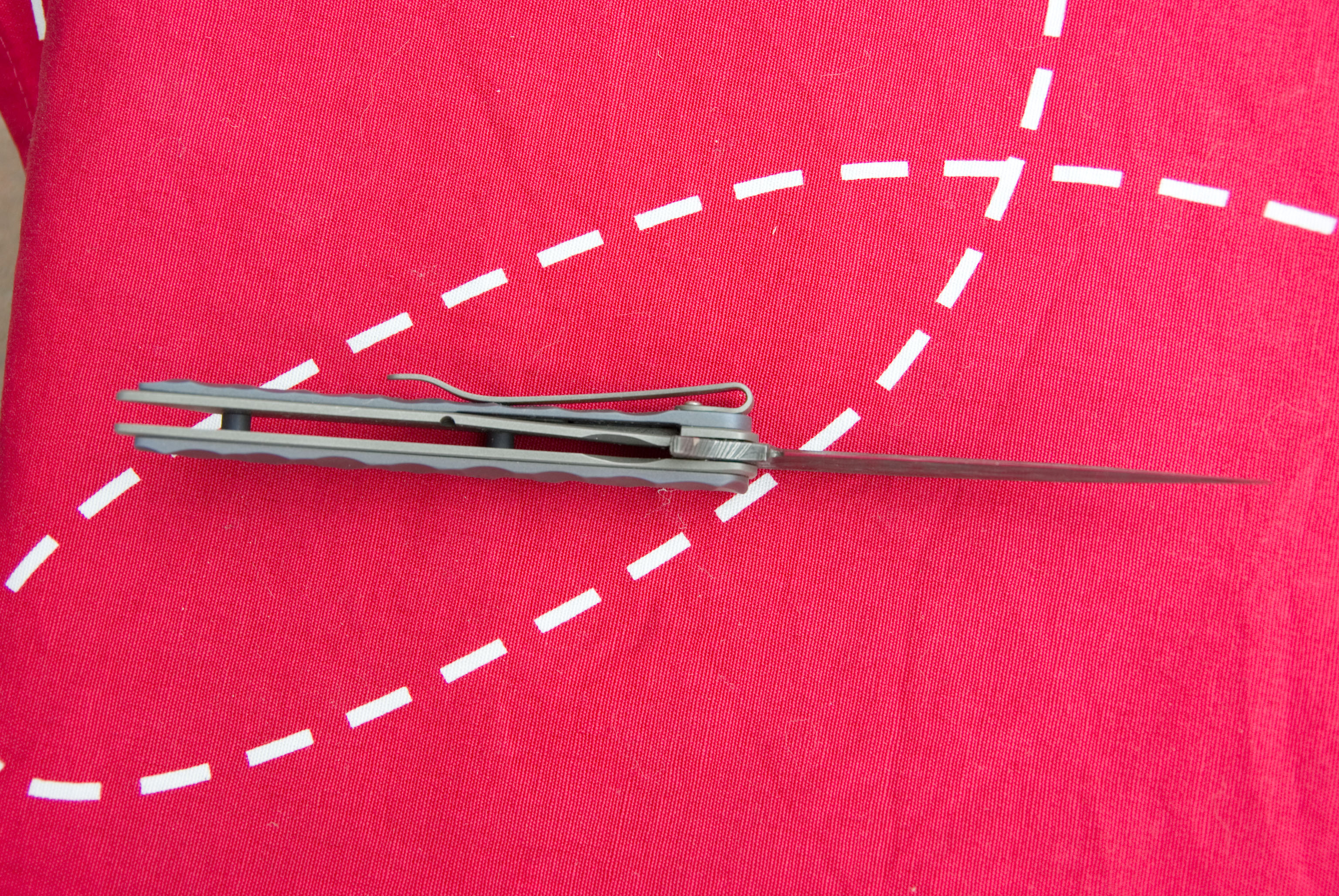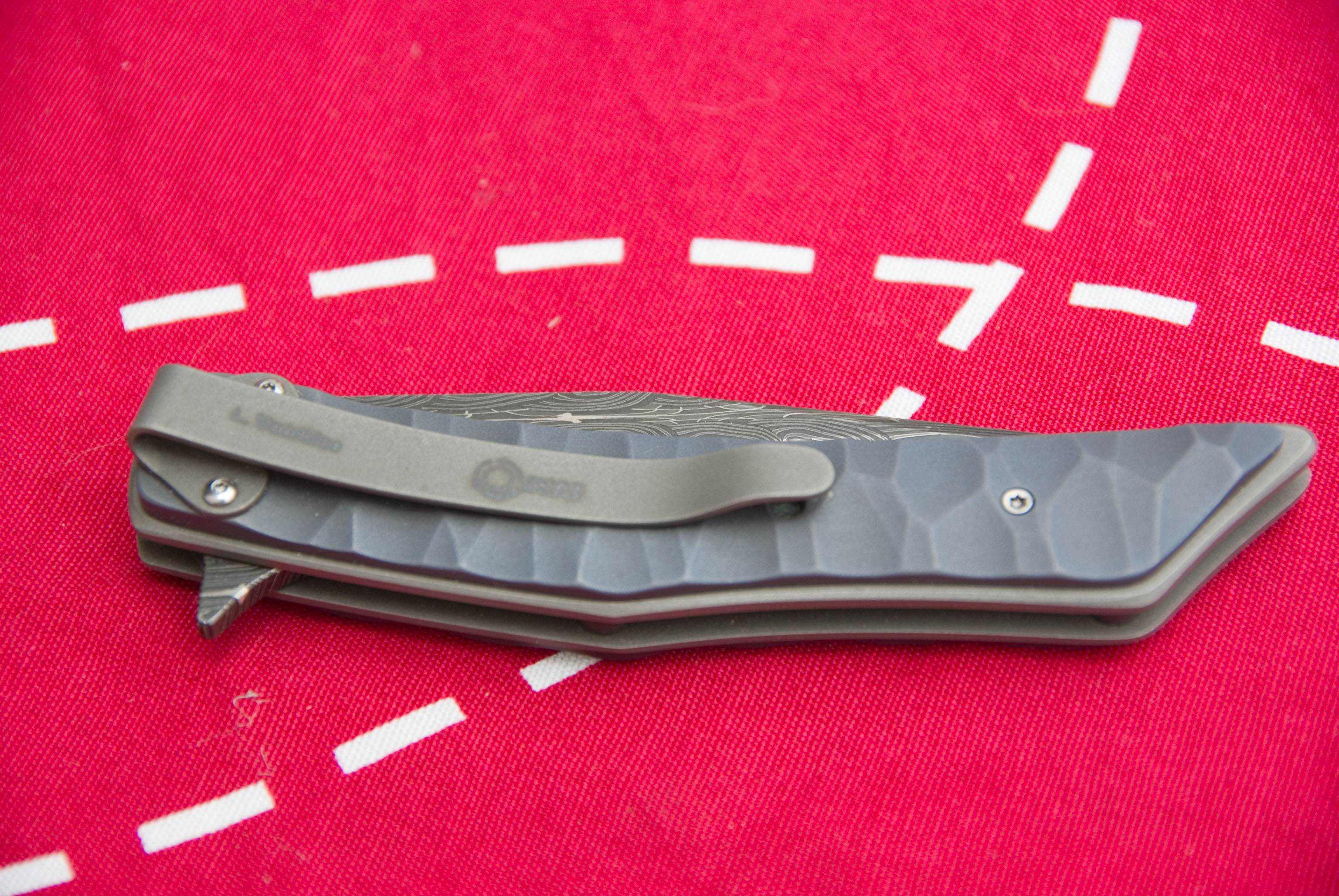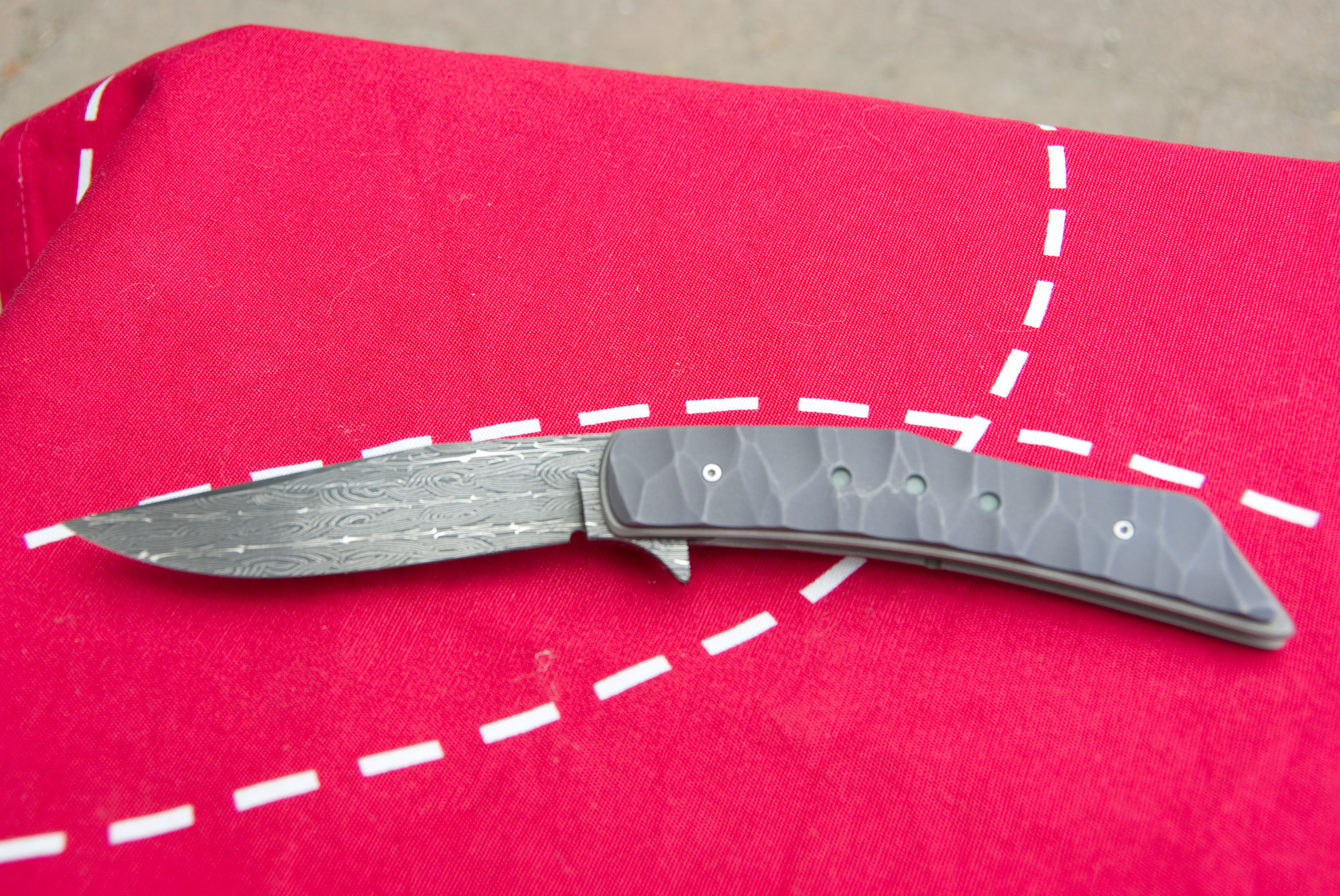 Les Voorhies one off Eggerling damascus flipper with glow in the dark inserts and nicely sculpted full titanium scales. Excellent condition with only a couple of light snail trails. No marks on the blade at all. The blade is 3.5" and OAL is a little over 8.2". Runs on IKBS bearings and the action is very smooth with a nice and strong lockup. The blade is centered.