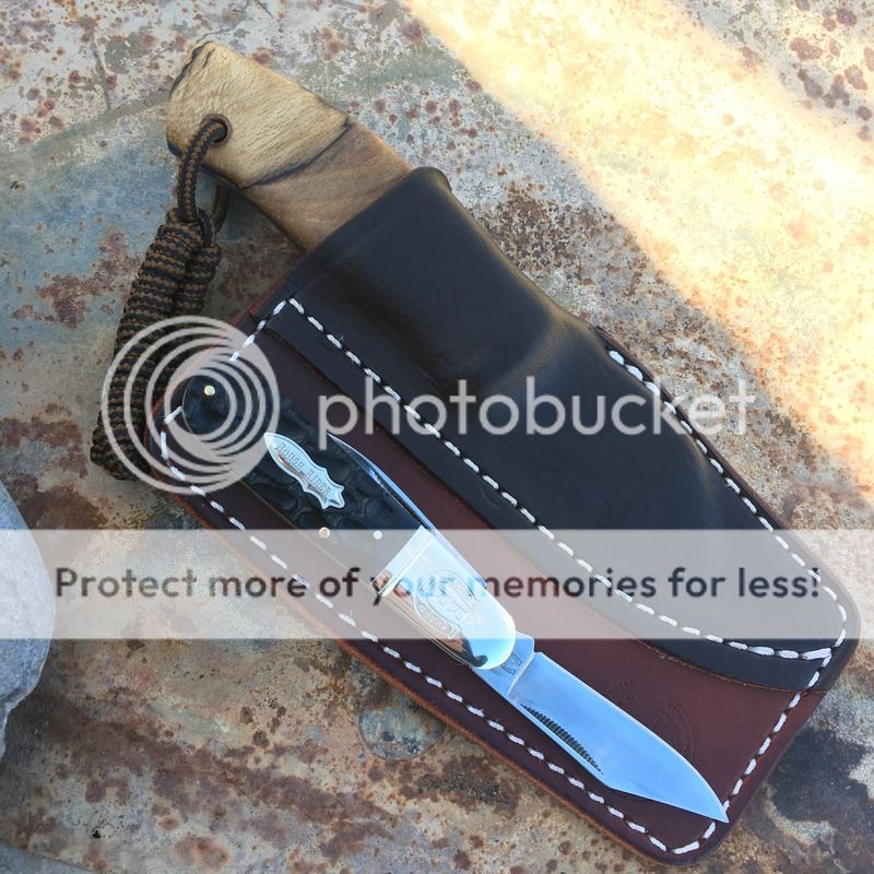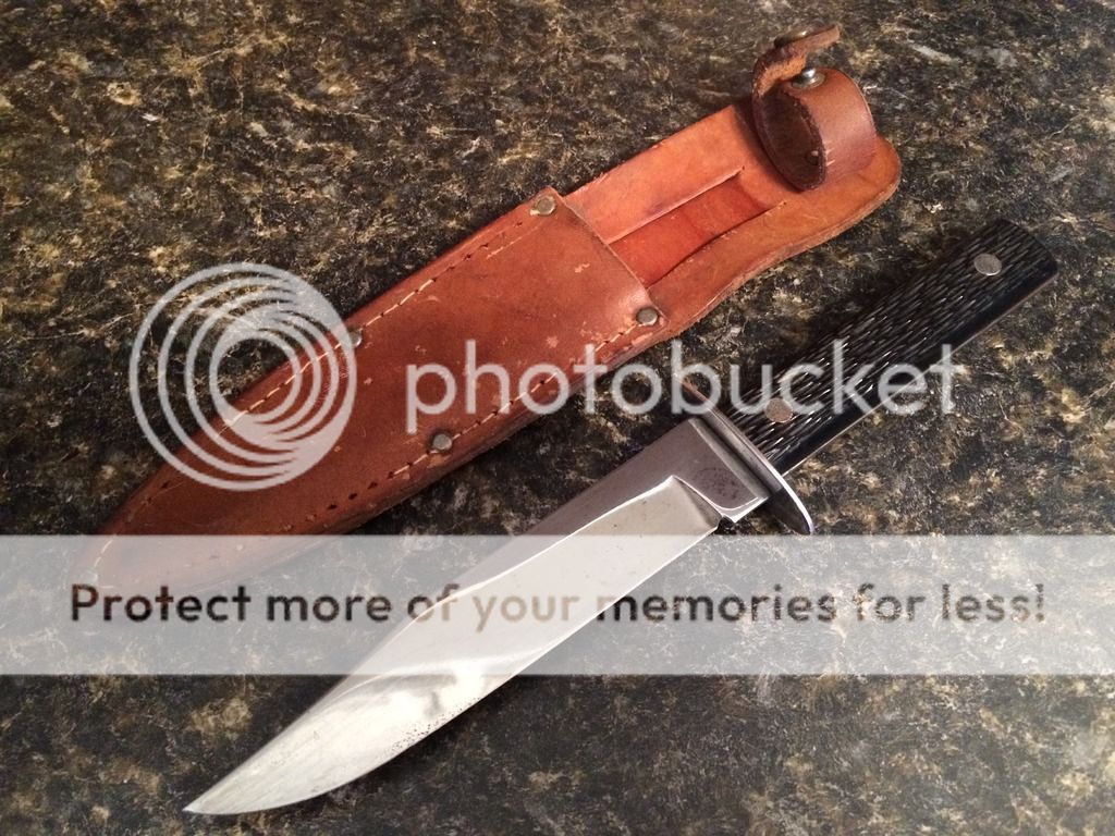 And this is a nostalgia buy I just got in the mail today. It's an older Imperial. How old? What model? I don't know, I was hoping you guys could help me. As a kid, my first knife was an iImperial fixed blade. It had the striped metal handle IIRC. I abused that knife, but I sure felt like quite the woodsman and cowboy with it. So when I found this one on ebay for cheap, I just couldn't resist. It also has that cowboy bowie look and some age on it so I also wanted it to resheath and stick on a gunbelt with a patinad Ruger Blackhawk.