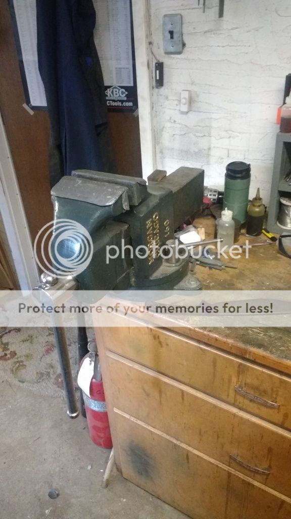 I have a 6" here because it looks good, but it's really too big for knife work. 3-3.5" jaws is about perfect for everything we do, and I'm planning on swapping it with one of my 3" vises before too long. A few things to look for When buying a vise is wear and damage. Try opening the vise with the handle. If it takes a full turn or more before the jaw starts moving it will require a thrust washer behind the screw in order to close up the wear. Next grab the moving jaw of the vise, and try to move it around any way you can. Forward and back movement indicated the nut needs to be shimmed. Excessive side to side or up hand down movement (say 1/8-1/4" or more) means either the vise was badly made, or its had a long life and is wearing out. You want your vise to be as tight as possible. Excessive denting or any cracks are signs of severe abuse, and should be avoided.