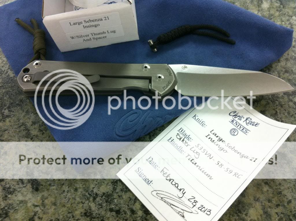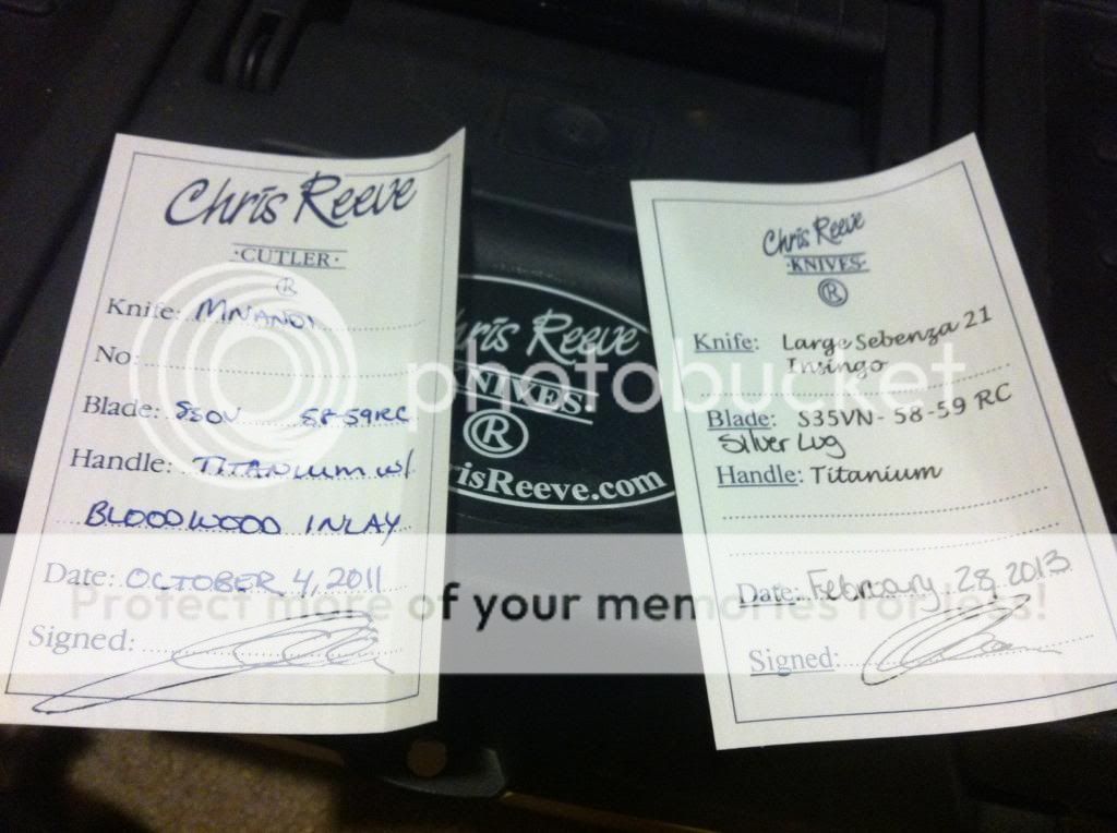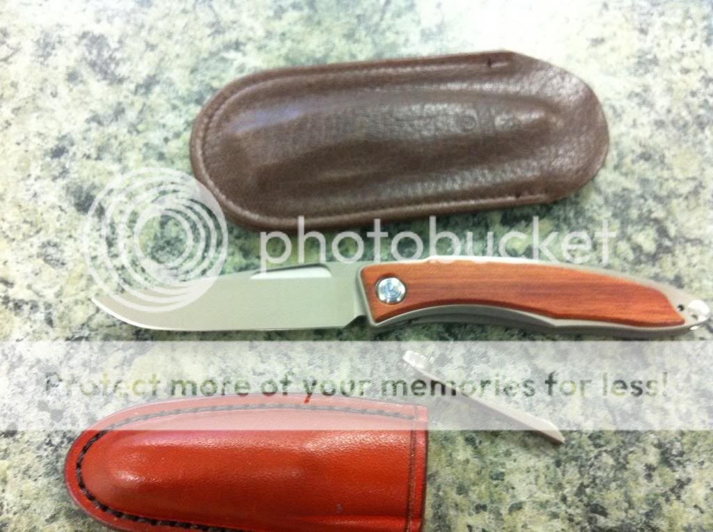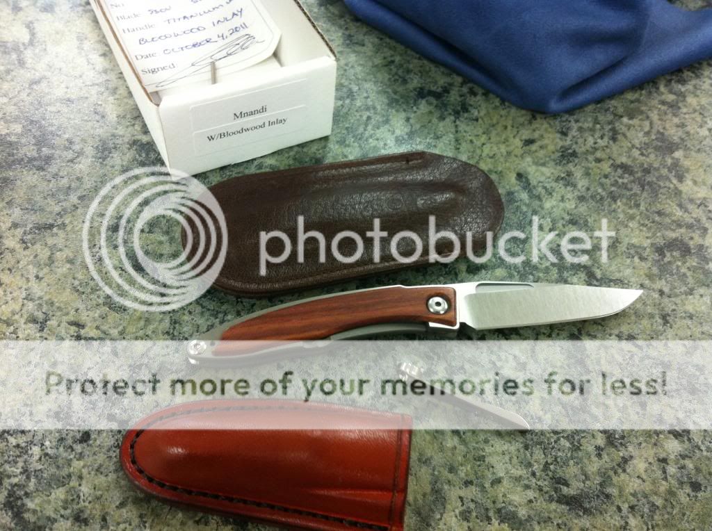 -Mnandi- bought on a whim because of the DOB 10/4/11, very nice knife but I dont go to enough weddings or funerals to justify it, comes with box, card, sticker, wrench, warranty card, cloth, clip has been removed but is included, CRK leather sheath and spare leather sheath pictured.