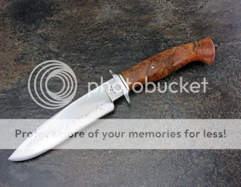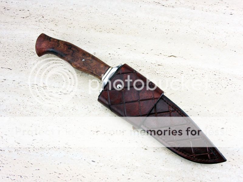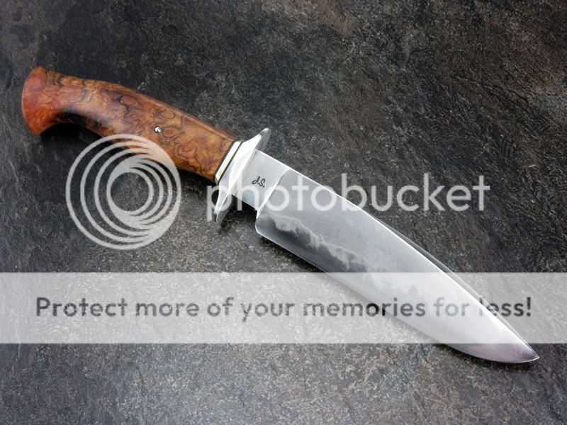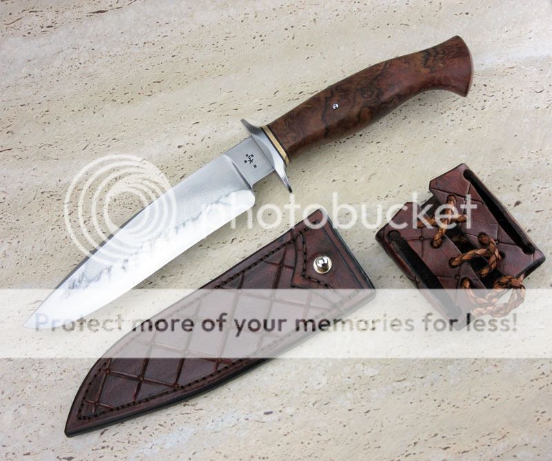 Specs : BL 5 1/2", 140mm. OAL 11", 280mm. Forged W2 with Hamon. Flat ground with a convex edge. Weighing in at 6 1/2 oz, 200 grms. Fast in the hand and the balance is spot on. Clip is sharp for 1 1/2", 38mm. Stainless sculptured guard with G10 and bronze spacers. Stabilised Coolibah burl handle. Tooled leather sheath with frog that allows traditional and cross carry.