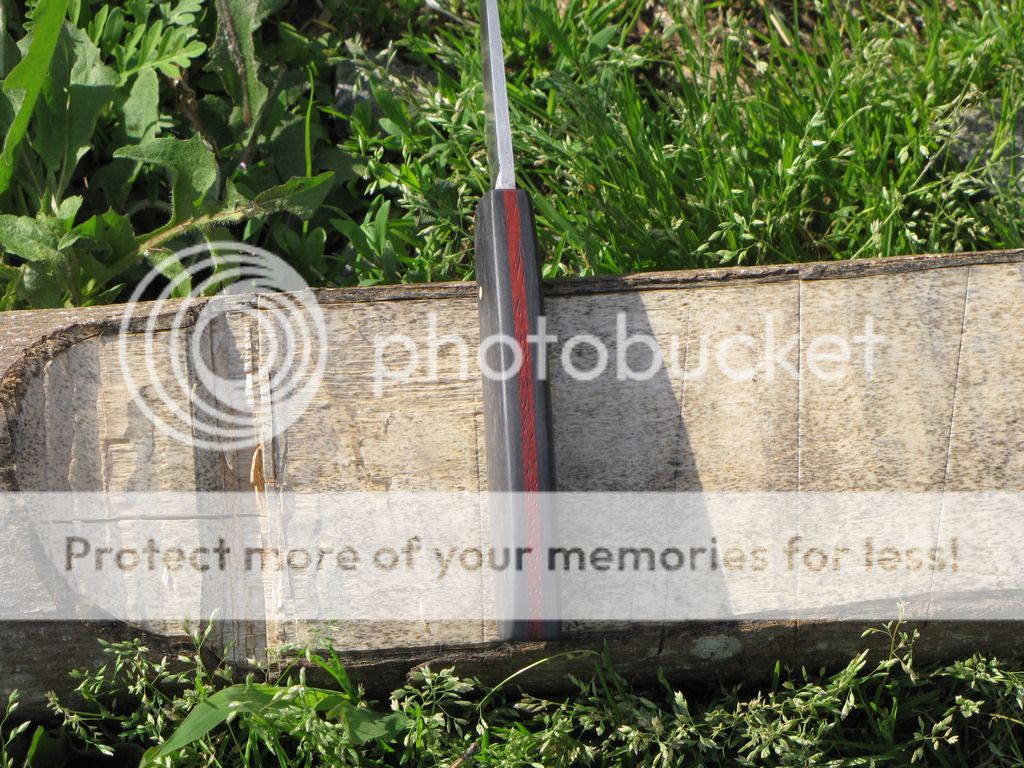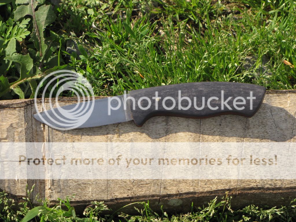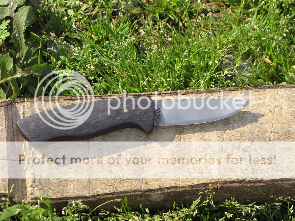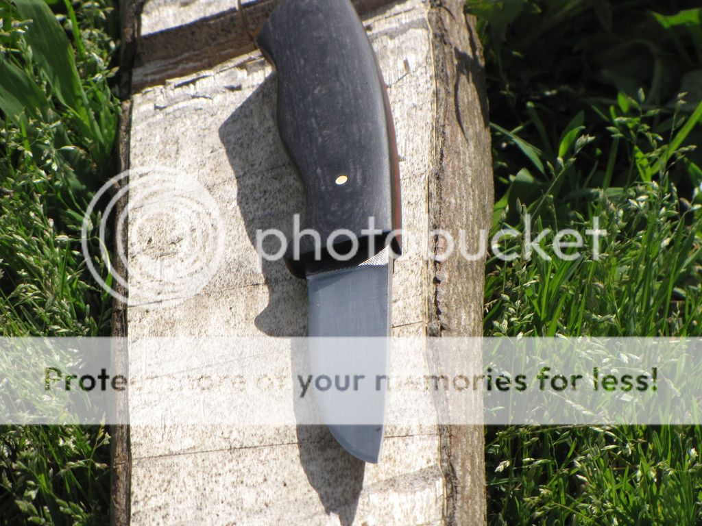 This knife is forged from a Nicholson file. It is flat ground with a high convex edge. The blade is 3 1/8" long. I heat treated it to 57-58 RC. It is a hidden tang. The handle has a Bloodwood frame with black Warwood scales. The handle is 4 1/8" This knife is super light. It would make an awesome trail knife. It would be easy to carry. Comes with a leather sheath.